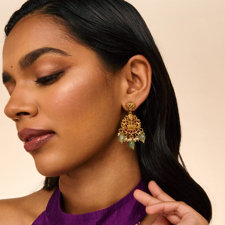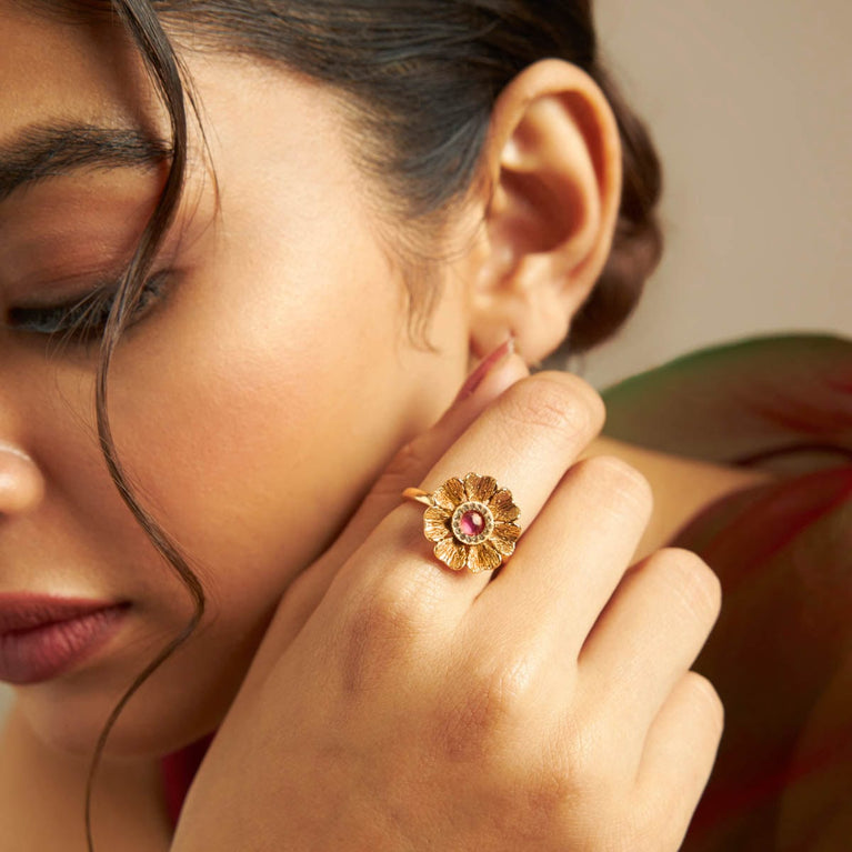 Intricate, festive, and contemporary, this fine ring is all. Adding a refreshing feel of full bloom, the white pearls, embossed gold plated floral design, floral rim, and hint of ruby stone, makes your look more exquisite and unique.