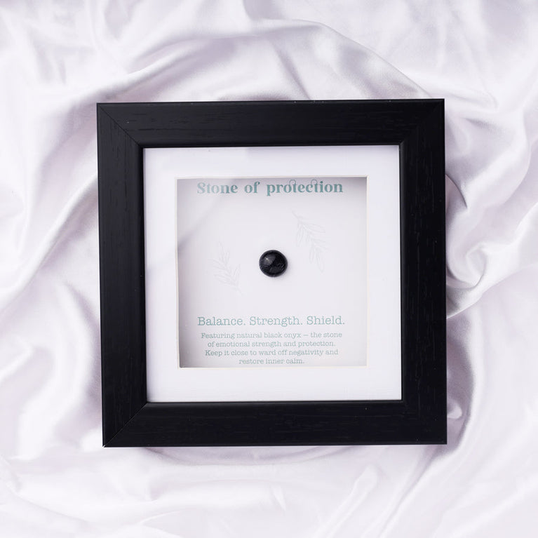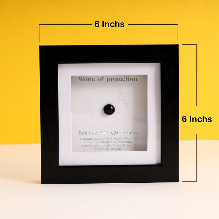 This Health and Happiness Frame features natural onyx—the stone of grounding and protection. Known for warding off negativity, building inner strength, and promoting emotional balance, this frame carries powerful protective energy.The onyx stone is authentic and certified by the Gemological Institute (certificate not included with the frame).Place it in your living space or workspace to benefit from its grounding and protective properties, or gift it to a loved one to bring them health, happiness, and emotional balance.Size: 15 x 15 cm
