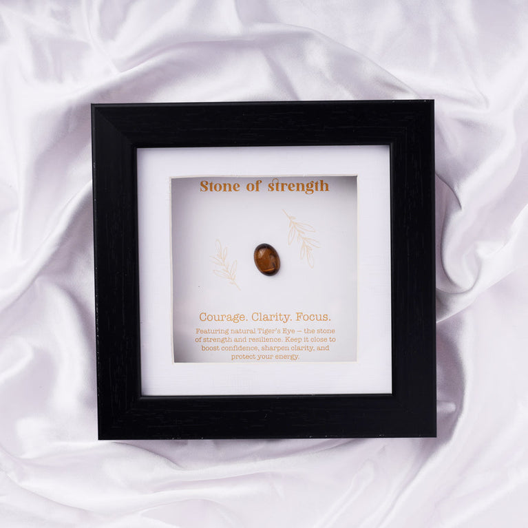 This Concentration Frame features natural Tiger’s Eye, the stone of strength and focus. Known for boosting confidence, clearing the mind, and enhancing concentration, this frame helps sharpen mental clarity and focus.The Tiger’s Eye stone is authentic and certified by the Gemological Institute (certificate not included with the frame).Place it in your study or workspace for maximum effect, or gift it to a loved one to help them achieve mental clarity, focus, and inner strength.Size: 15 x 15 cm