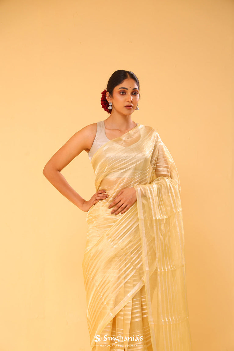 This is a flax gold tissue banarasi silk saree for festive, wedding occasions and party wear. Adorned with gold zari stripes weaving all over the body and very small border , completing the whole look.