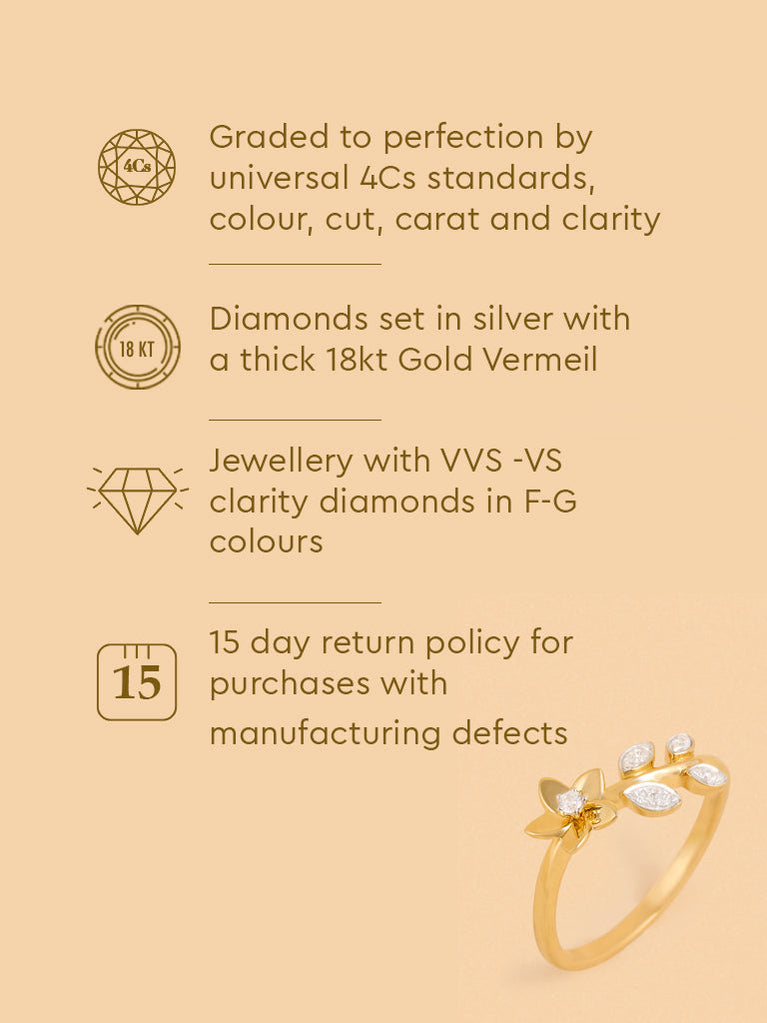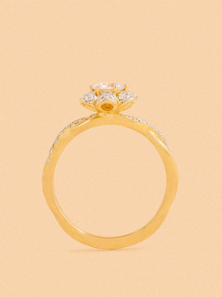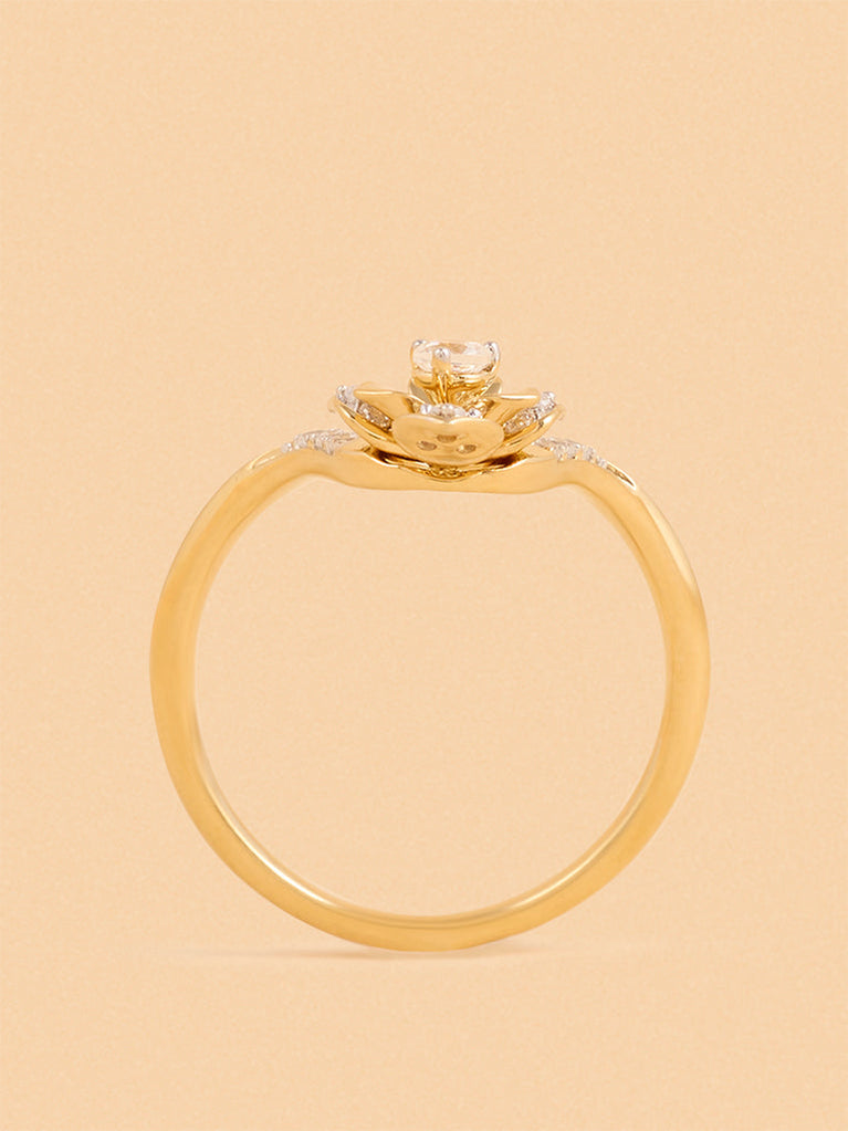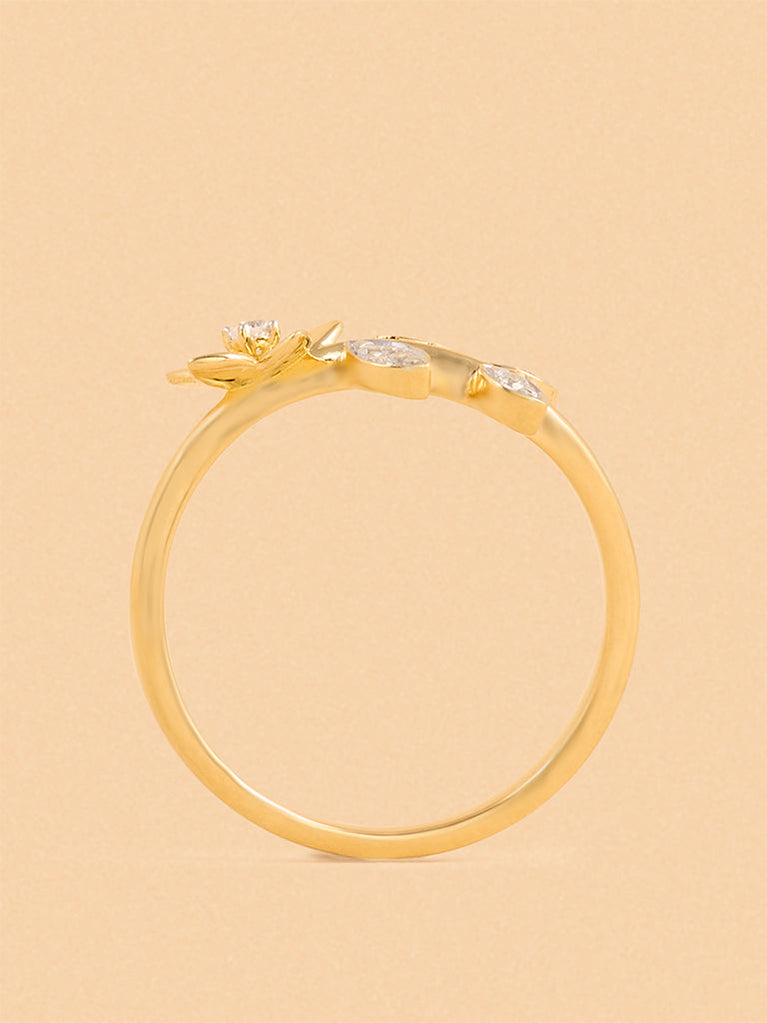 This gold floral solitaire ring from Westside X Pome features a delicate floral motif with a polished gold-tone band. A clear central stone sits at the heart of the design, complemented by small leaf-shaped accents along the band, each adorned with clear stones. With its slender profile and subtle detailing, this piece brings a refined touch to both everyday wear and special occasions.