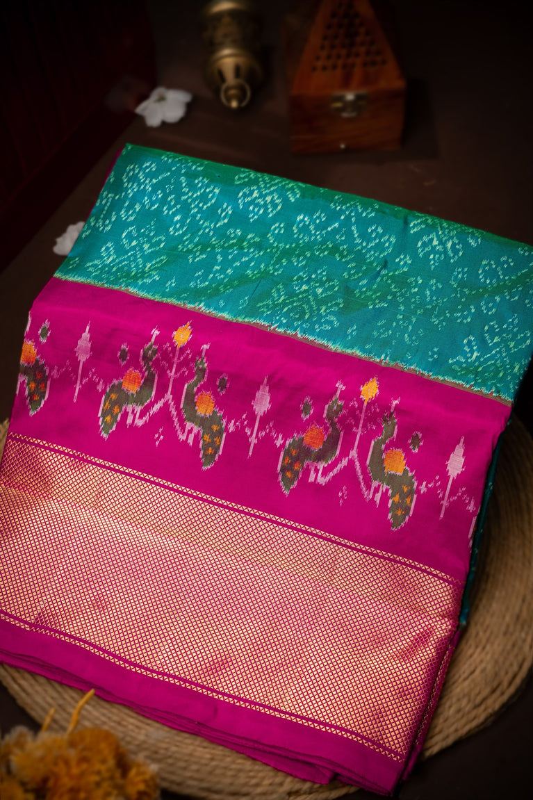 Mandir Teal Green & Pink Ikat Ikat Saree