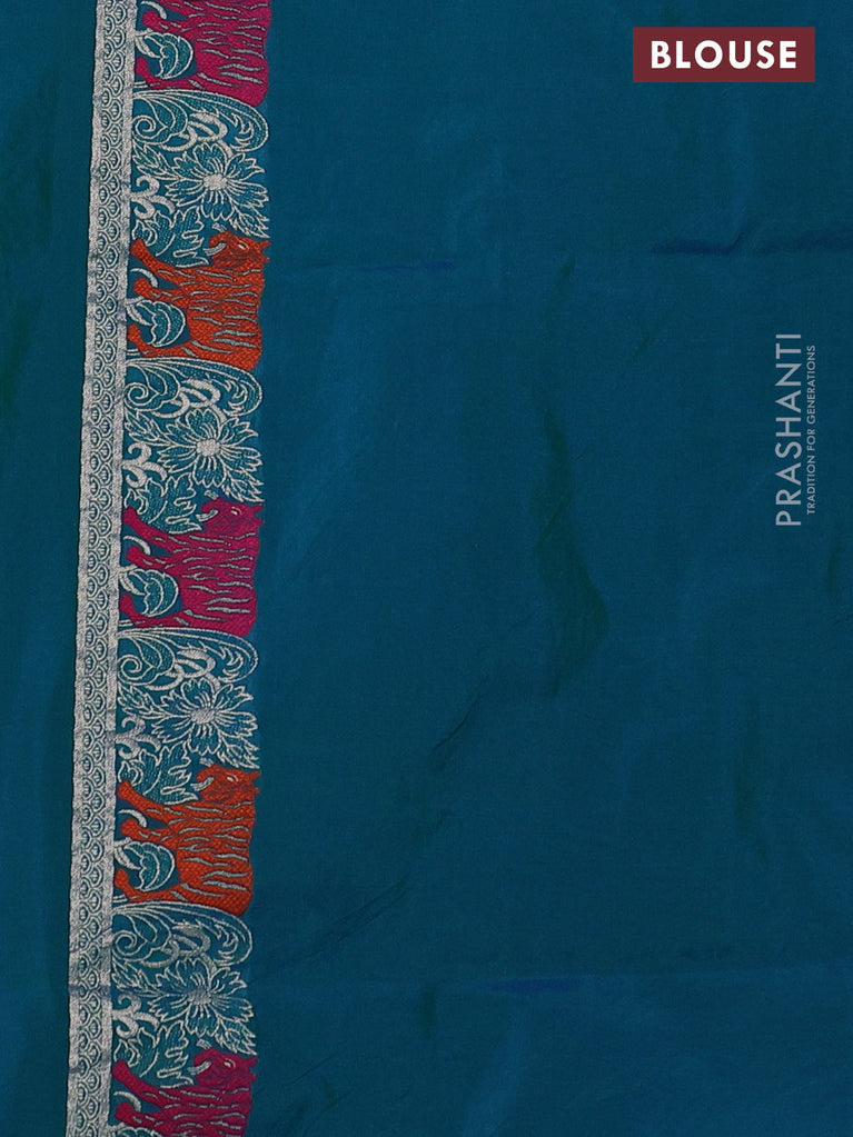Banarasi semi katan silk saree dual shade of teal bluish green with allover silver & gold zari weaves and deer design zari woven border