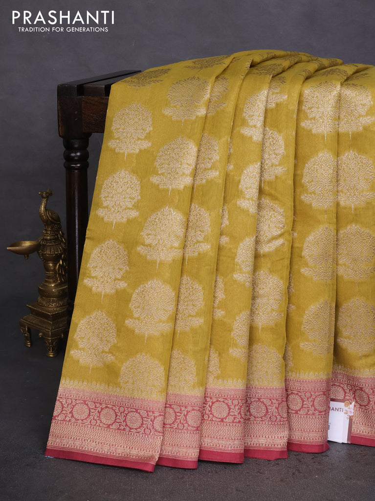 Banarasi silk cotton saree lime yellow and rust shade with allover zari woven brocade weaves and woven border