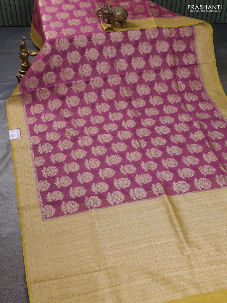 Banarasi silk cotton saree mauve pink and yellow with woven buttas and woven border