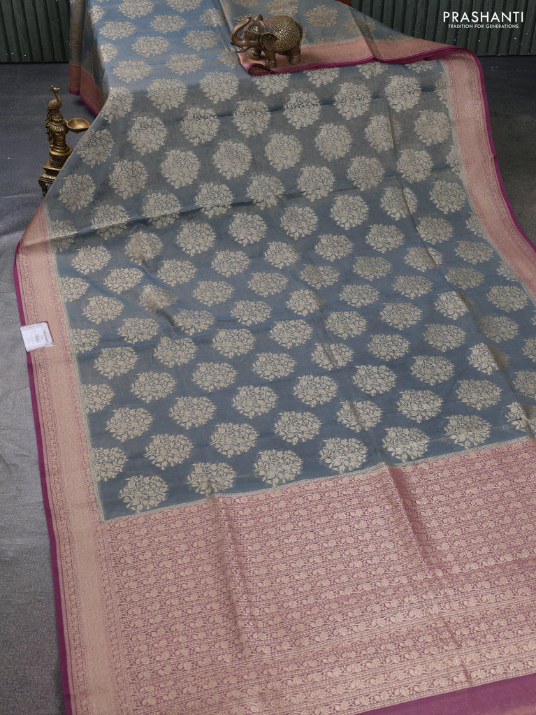 Banarasi tissue silk cotton saree grey and wine shade with allover thread & zari woven butta weaves and woven border