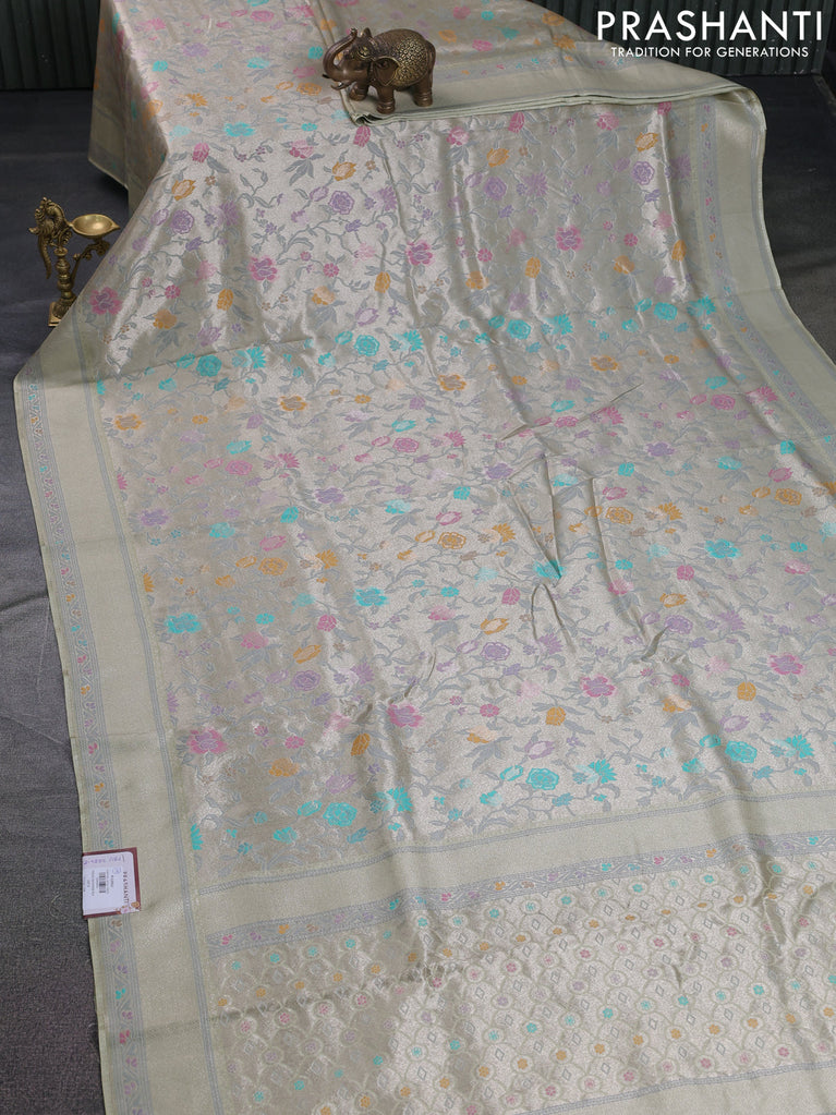 Banarasi tissue silk saree greyish green with allover silver & gold zari weaves and zari woven border
