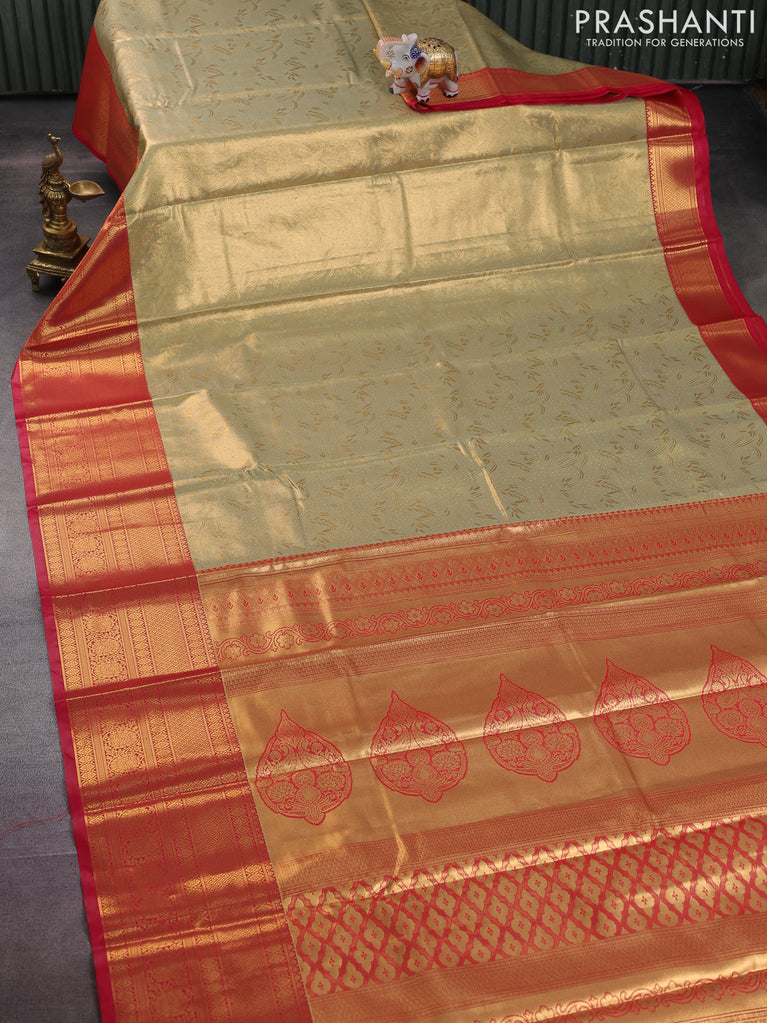 Bangalori tissue silk saree pastel green shade and reddish pink with allover zari woven brocade weaves and long zari woven border