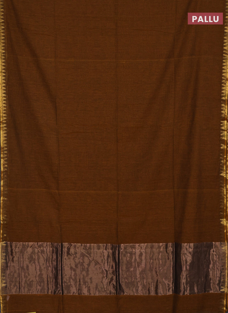Bengal soft cotton saree dark msutard with plain body and temple design zari woven border