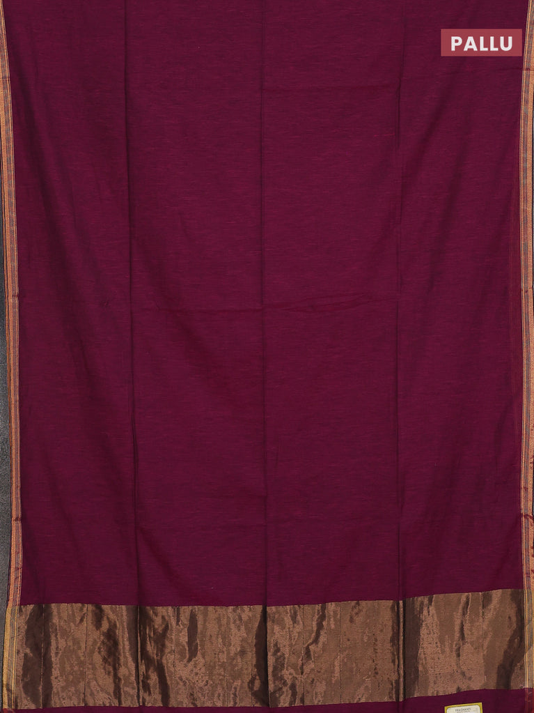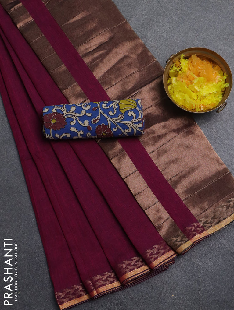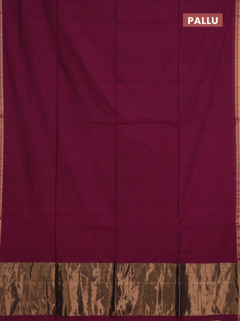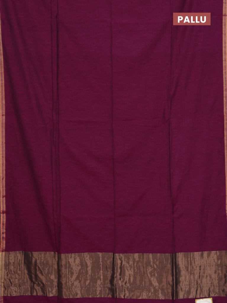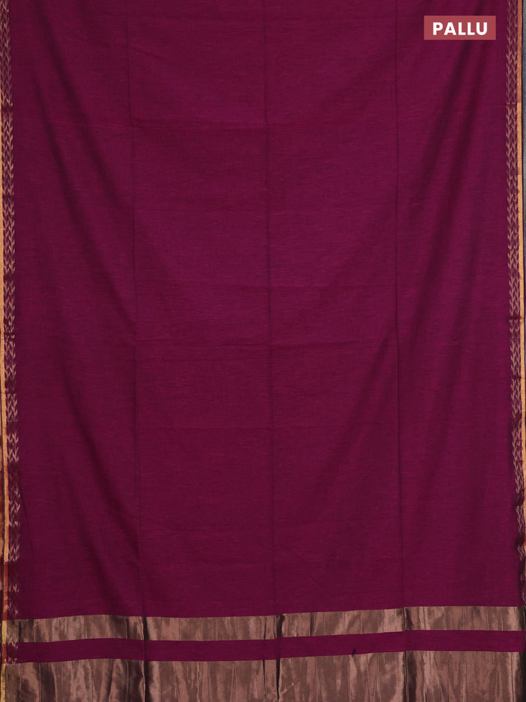 Bengal soft cotton saree dark magenta pink and blue with plain body and zari woven border