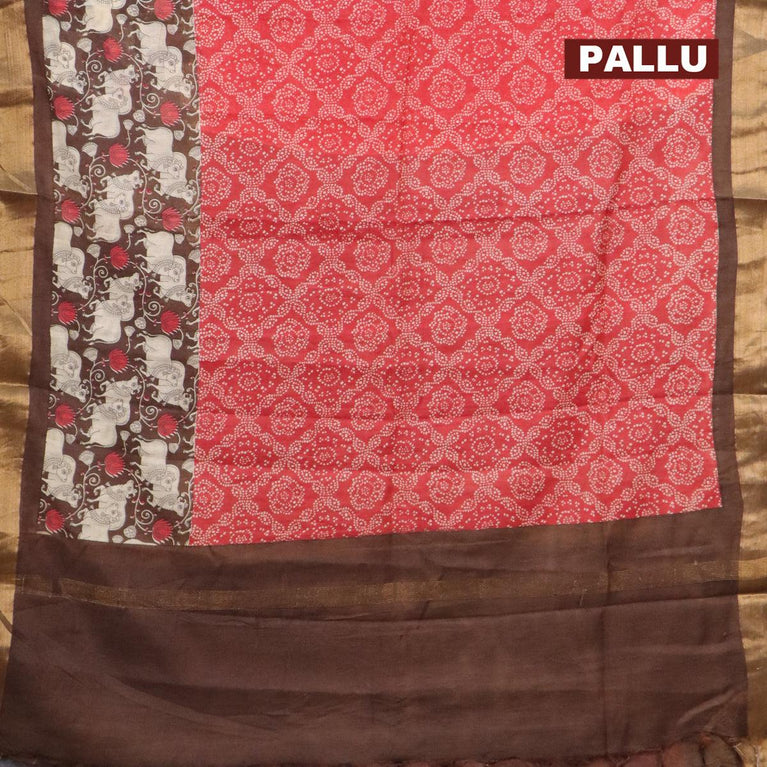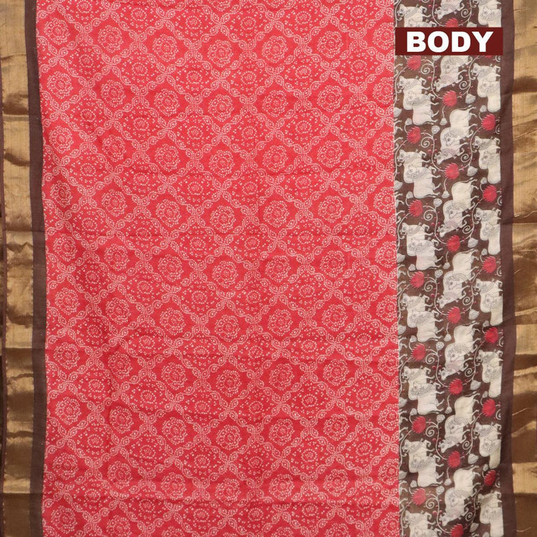 Bhagalpuri saree red and brown with allover bandhani prints and long pichwai printed zari woven border