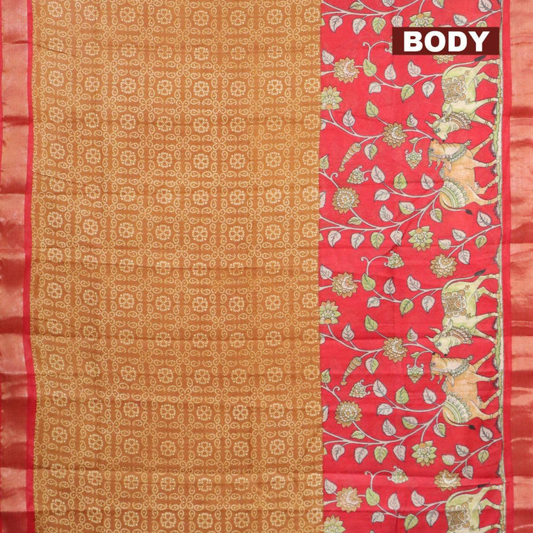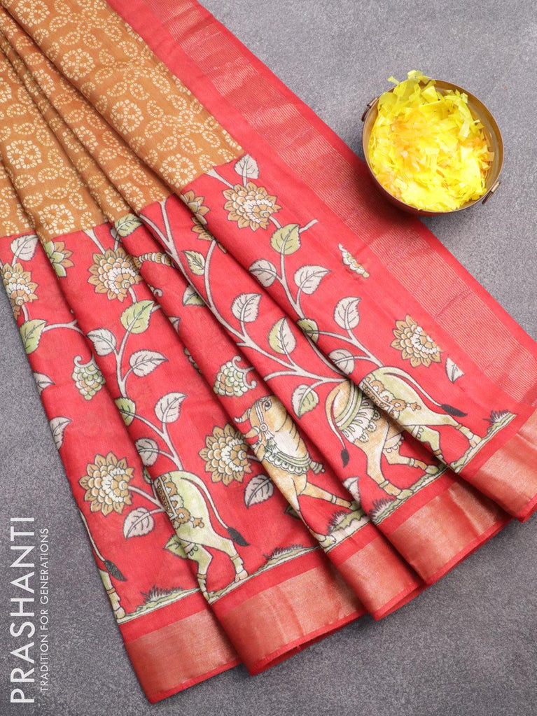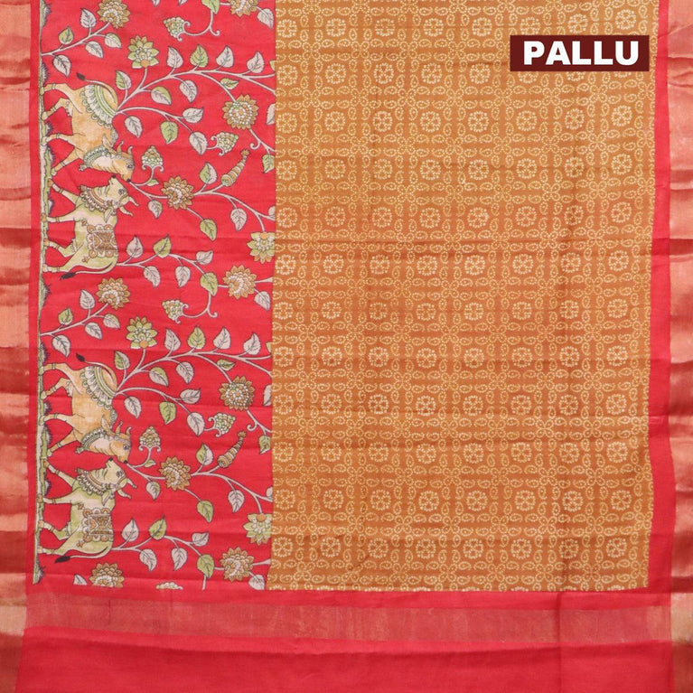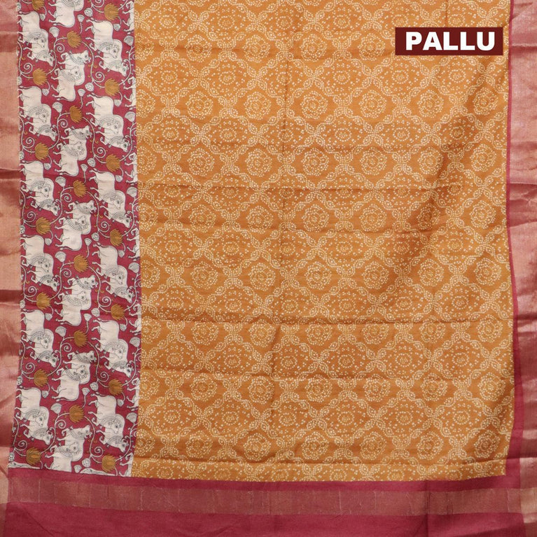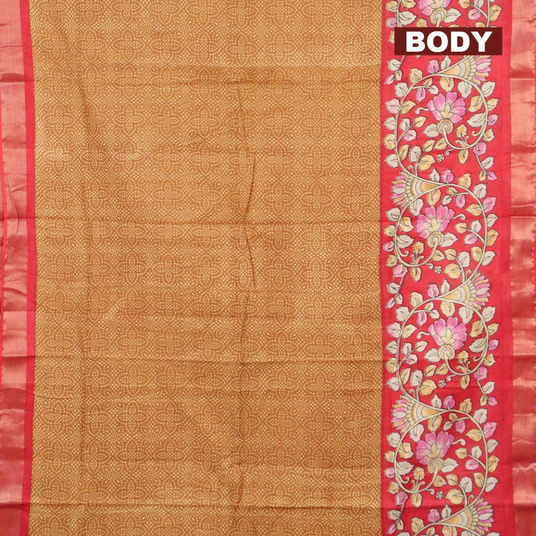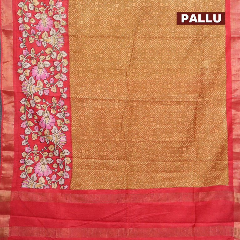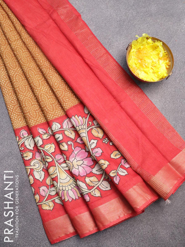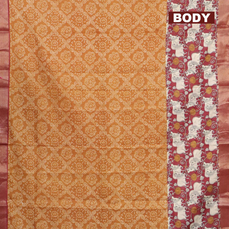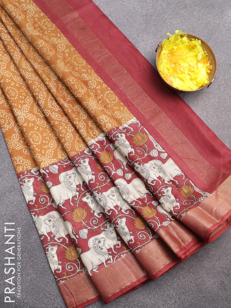 Bhagalpuri saree dark mustard and red with allover bandhani prints and long kalamkari printed zari border