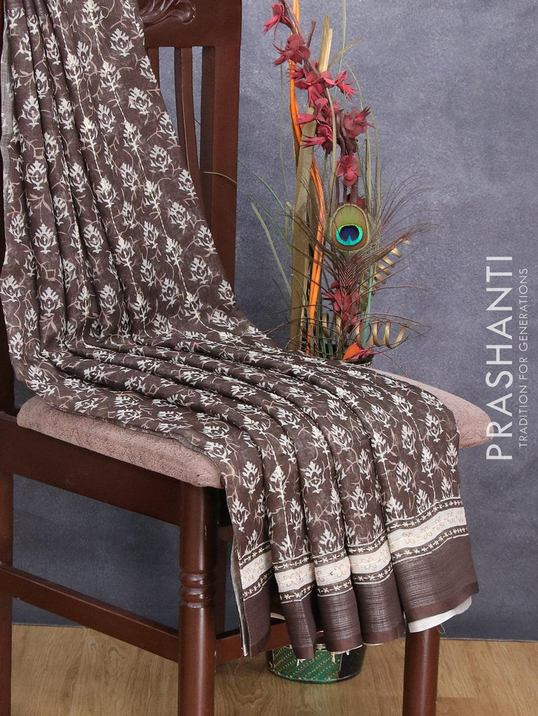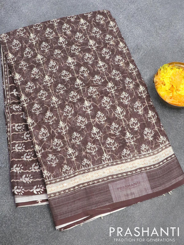 Bhagalpuri saree dark sap green with allover prints & kantha stitch work and silver zari woven border