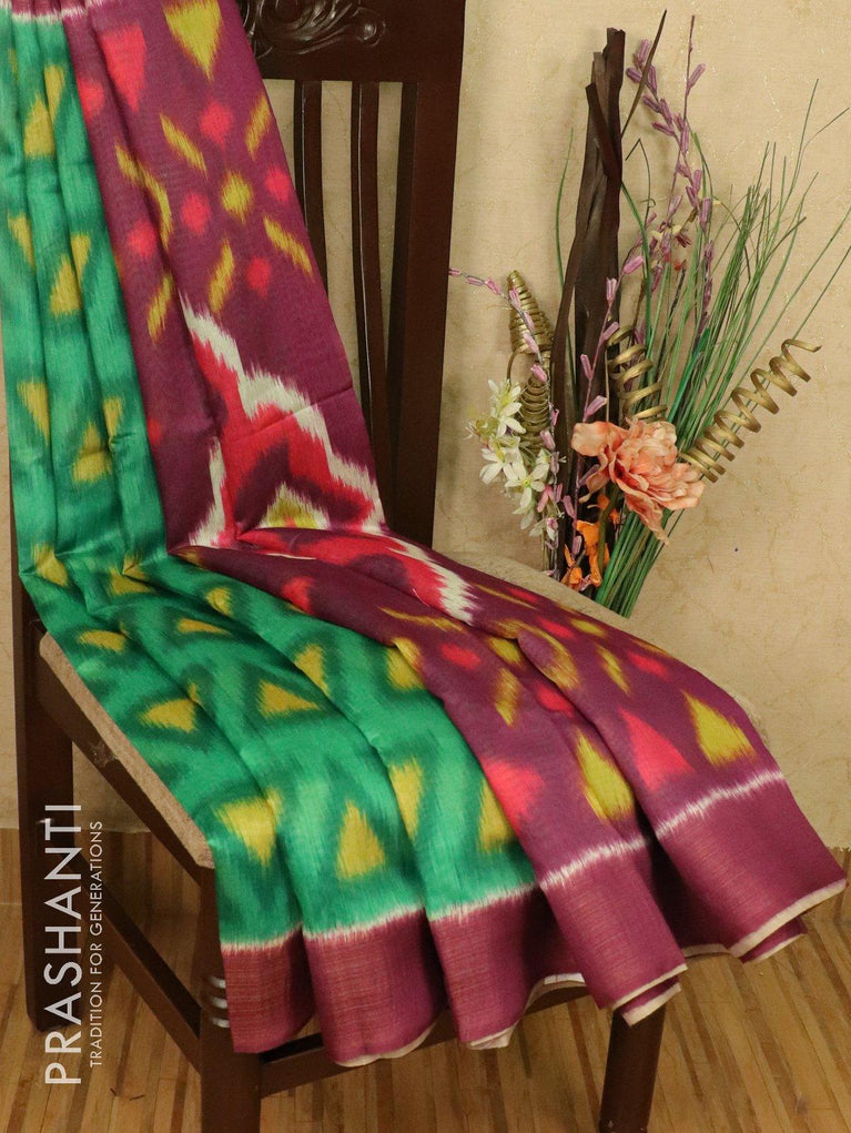 Bhagalpuri saree green and purple with allover ikat prints and simple zari border
