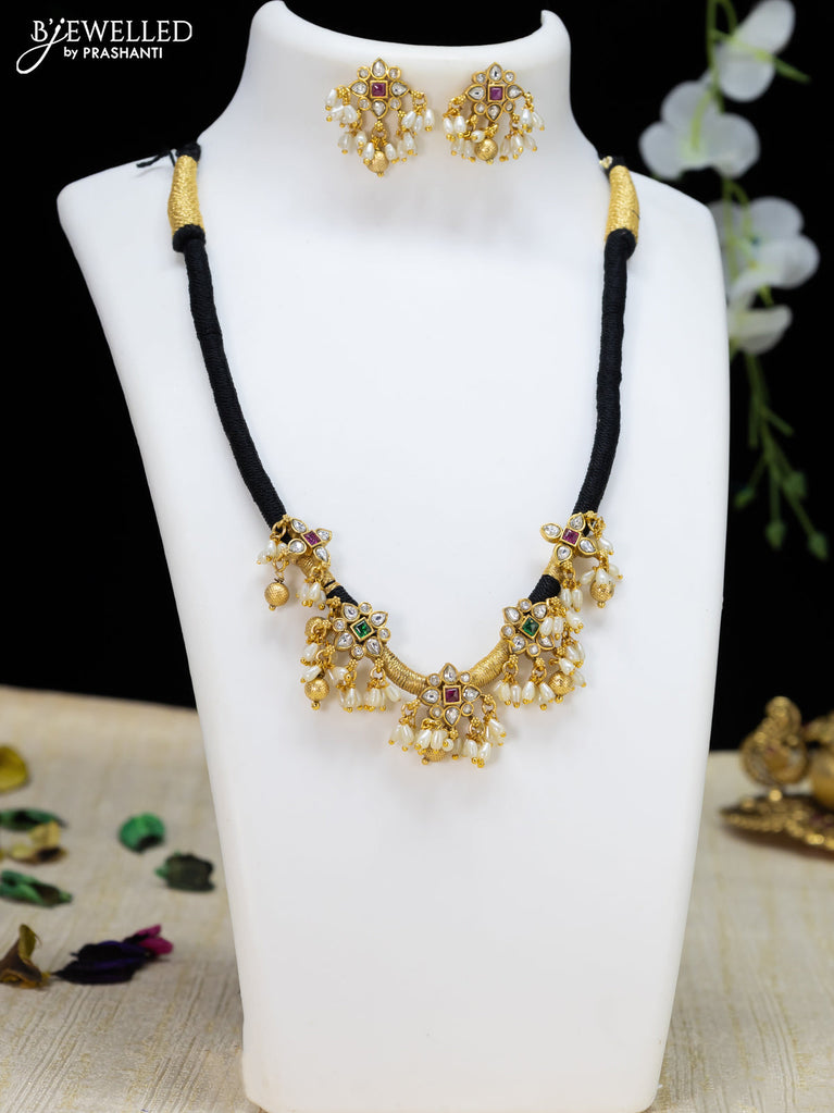 Black thread necklace manga pattern with kemp & kundan stones and pearl hangings