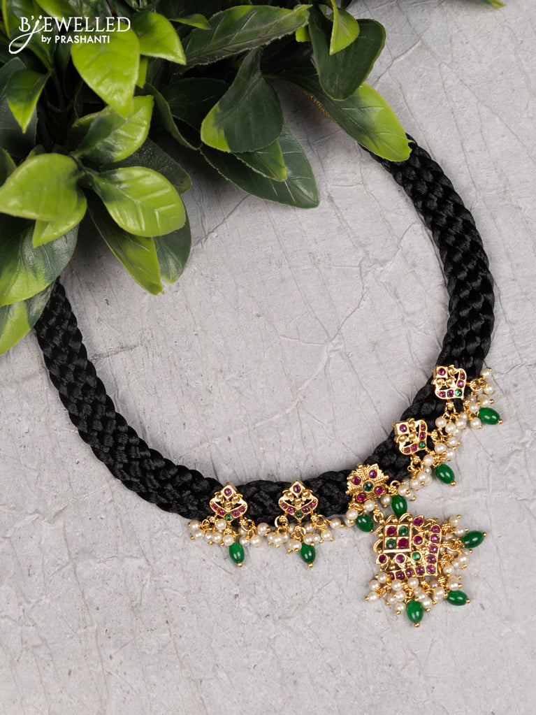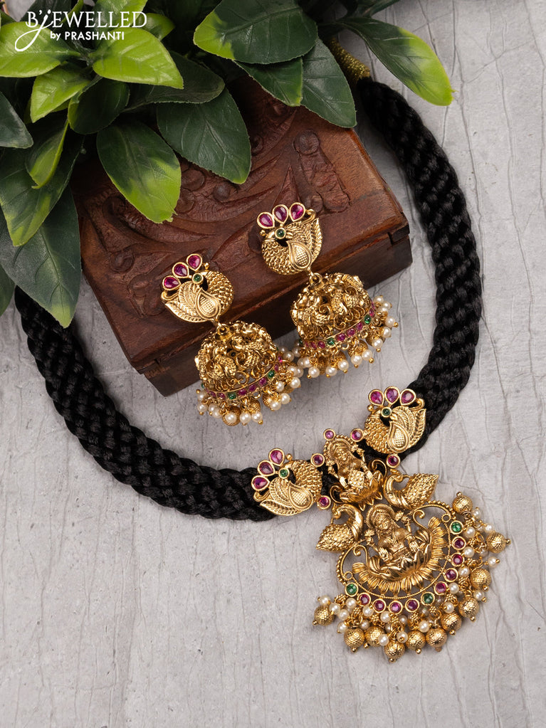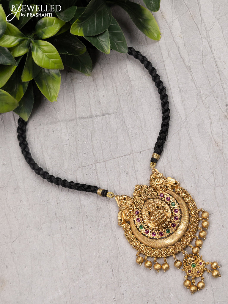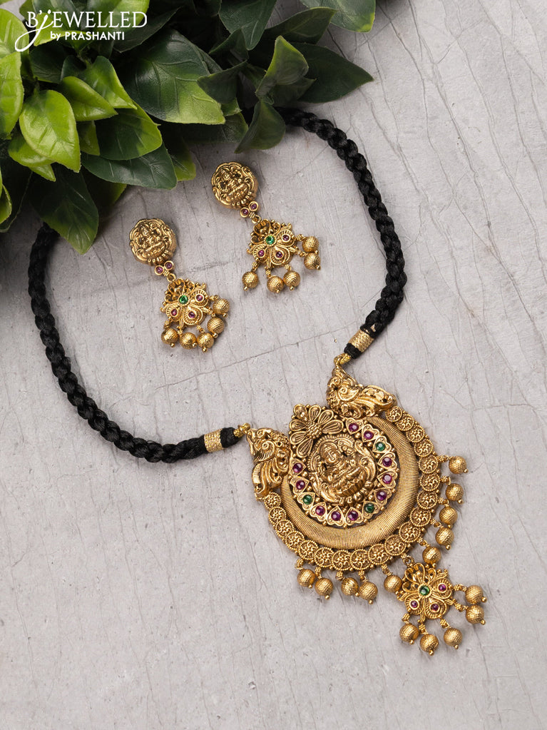 Black thread necklace with lakshmi pendant kemp stone and golden beads hangings