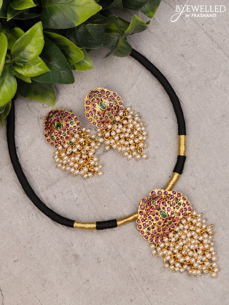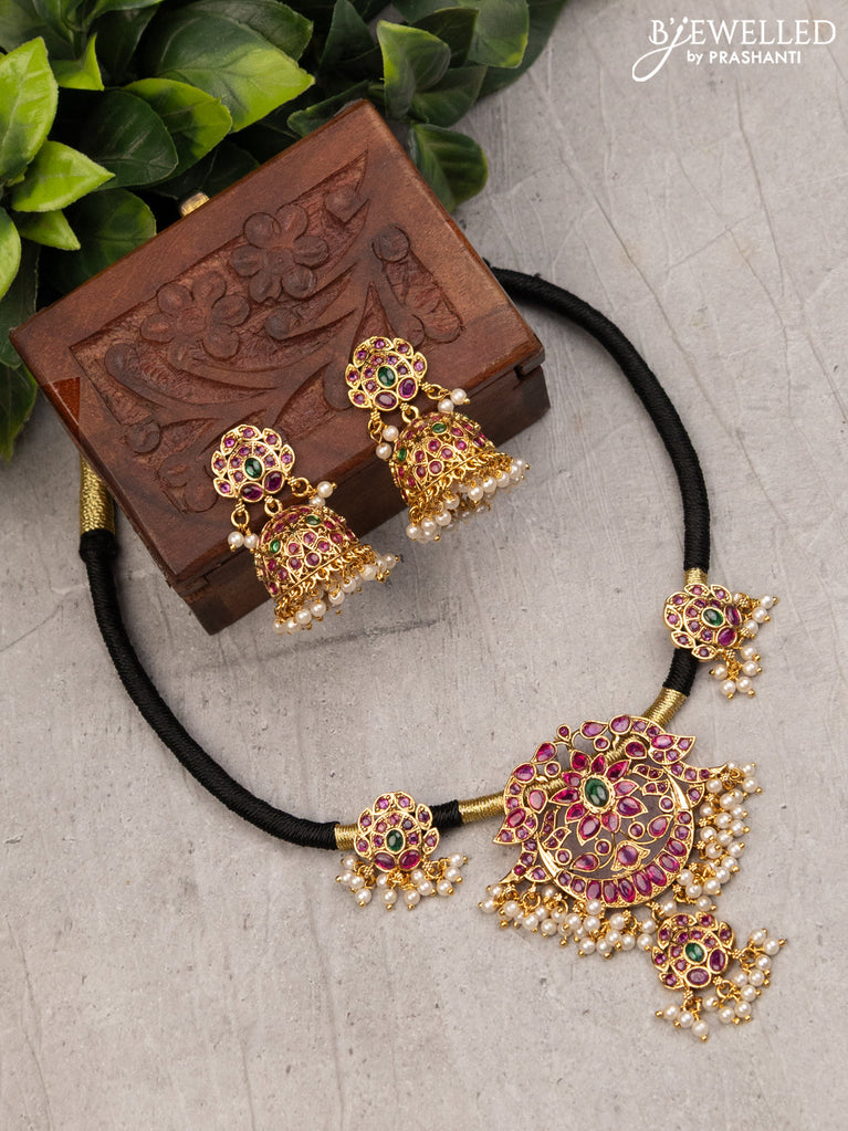 Black thread necklace with peacock design jhumka pendant kemp stone and pearl hangings without earrings
