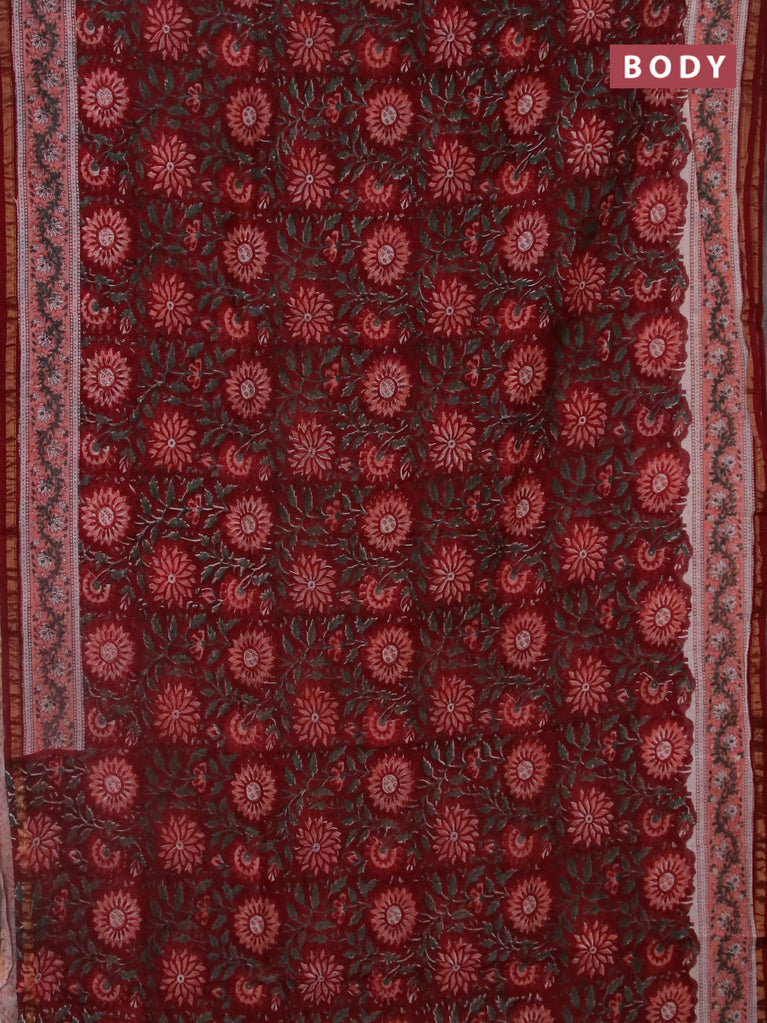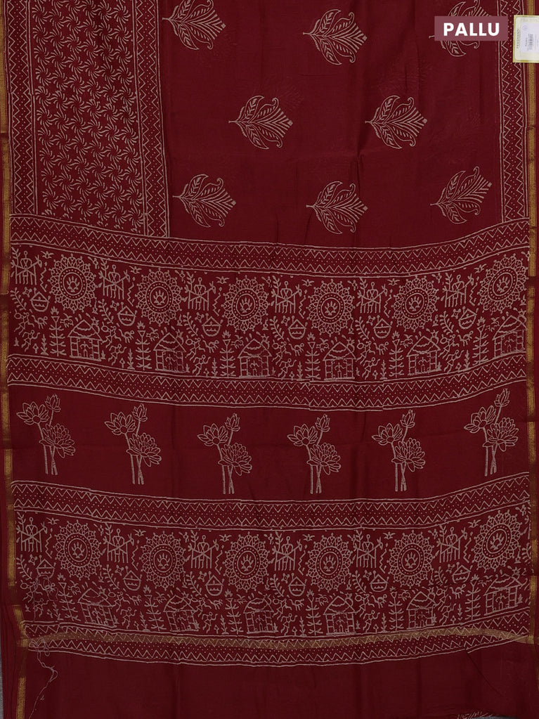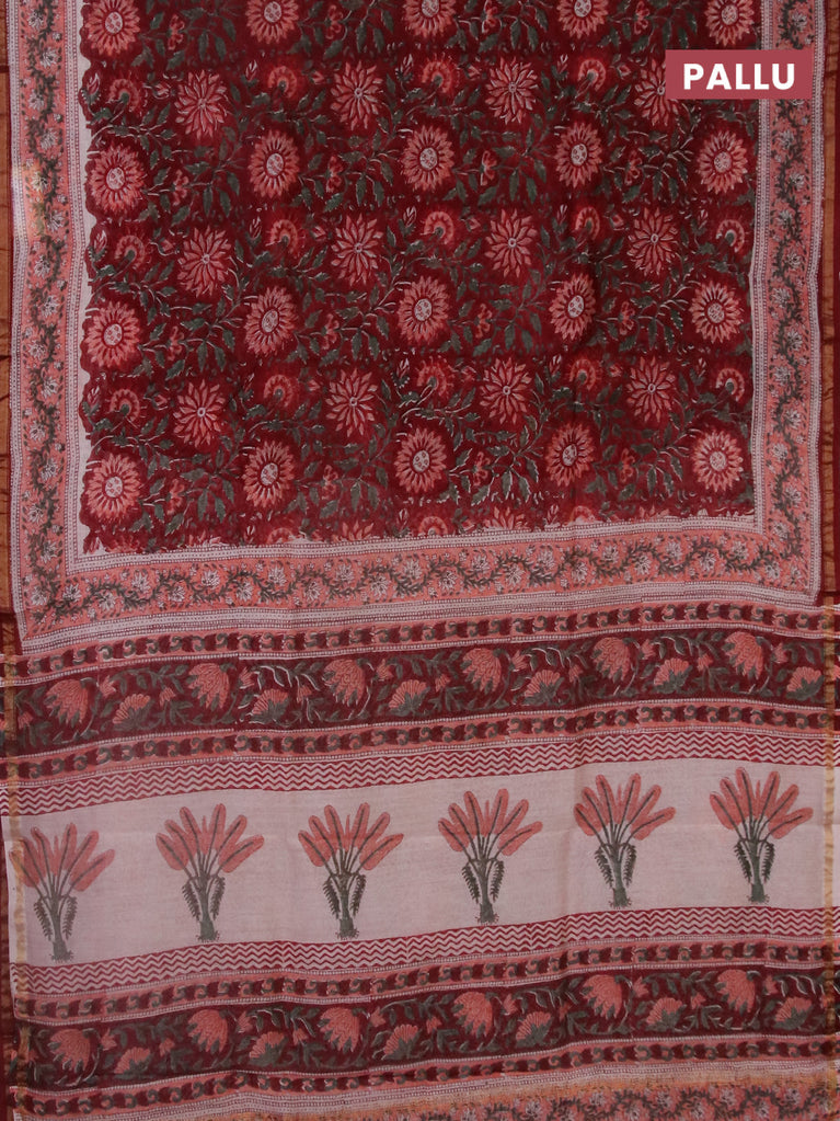 Chanderi bagru saree maroon and cream with allover prints and maheswari border