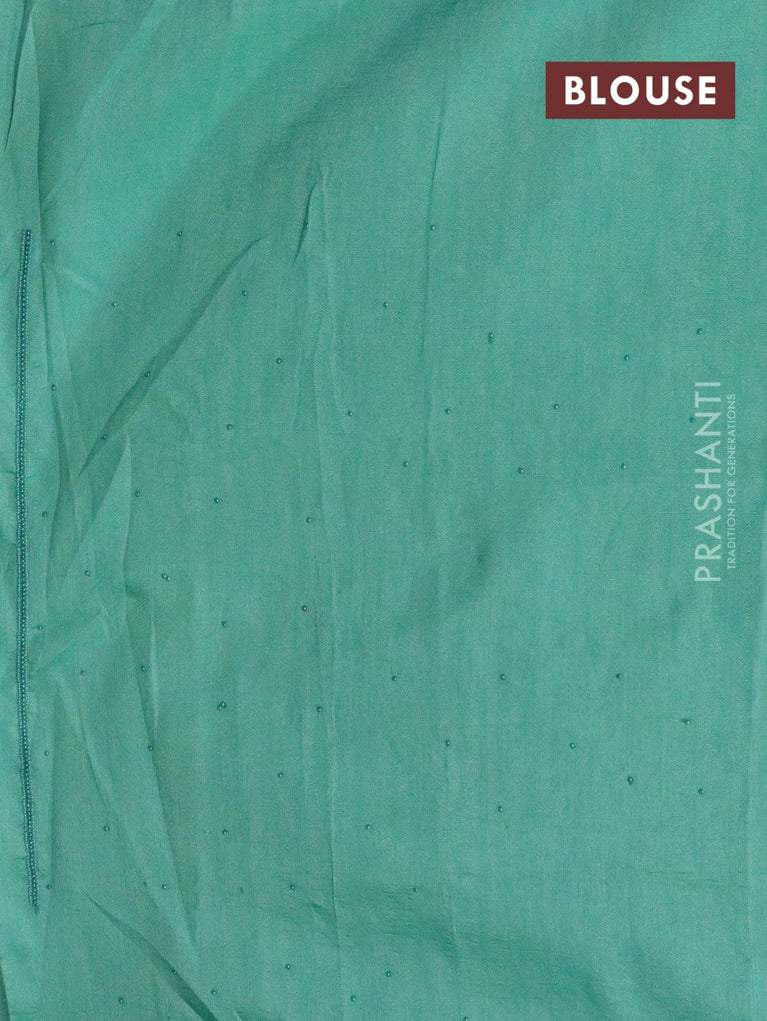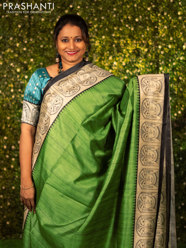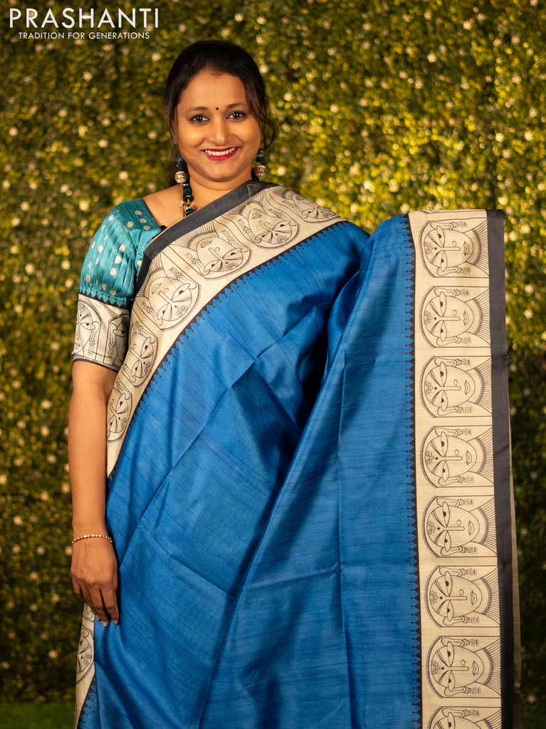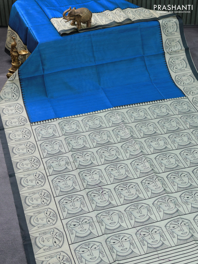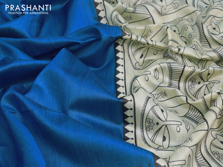 Chappa saree teal blue and cream with plain body and madhubani printed border