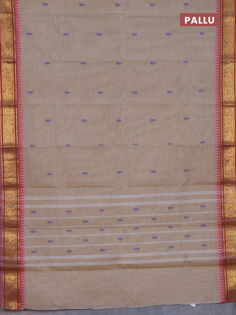 Chettinad cotton saree beige and maroon with thread woven buttas and temple disign zari woven border