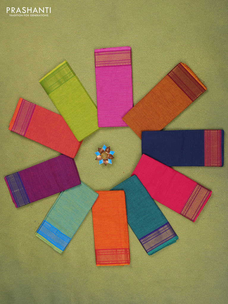 Chettinad cotton saree blue and dual shade of bluish maroon with plain body and long rettapet thread woven border