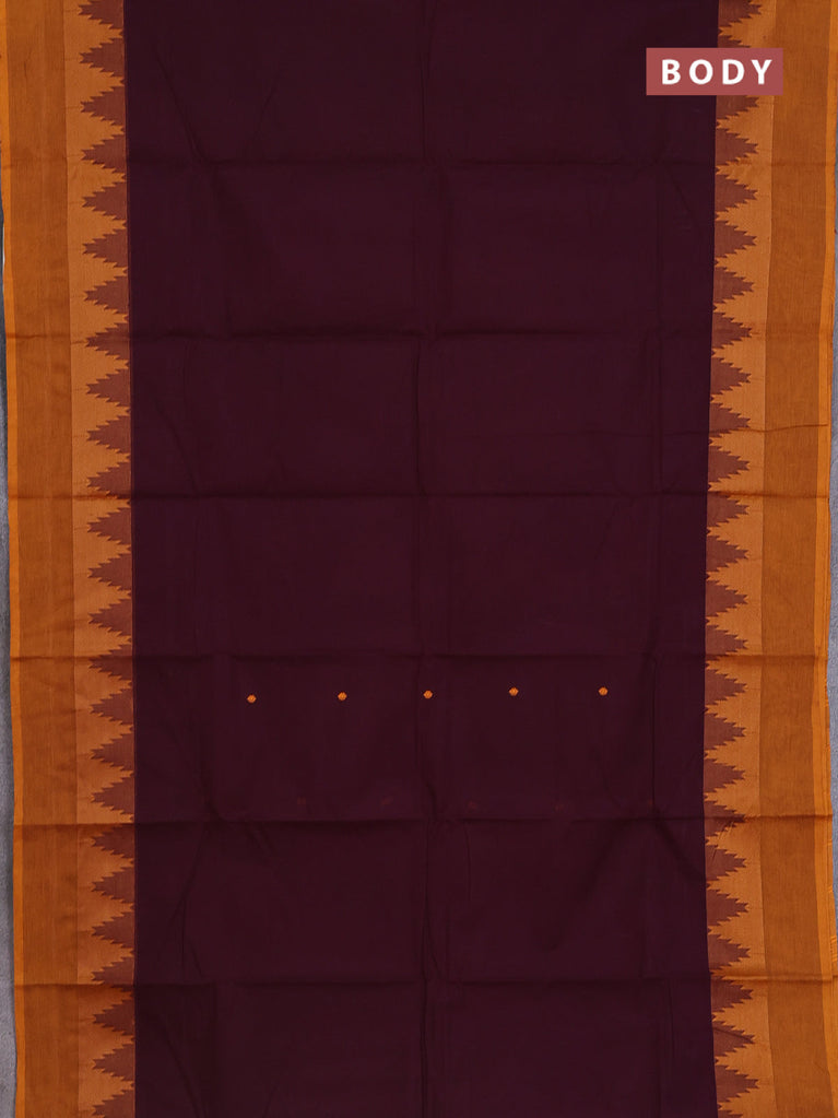 Chettinad cotton saree wine shade and dark mustard with thread woven buttas and temple thread woven simple border