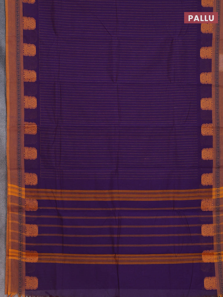 Chettinad cotton saree violet and mustard yellow with allover thread stripes pattern and thread woven simple border