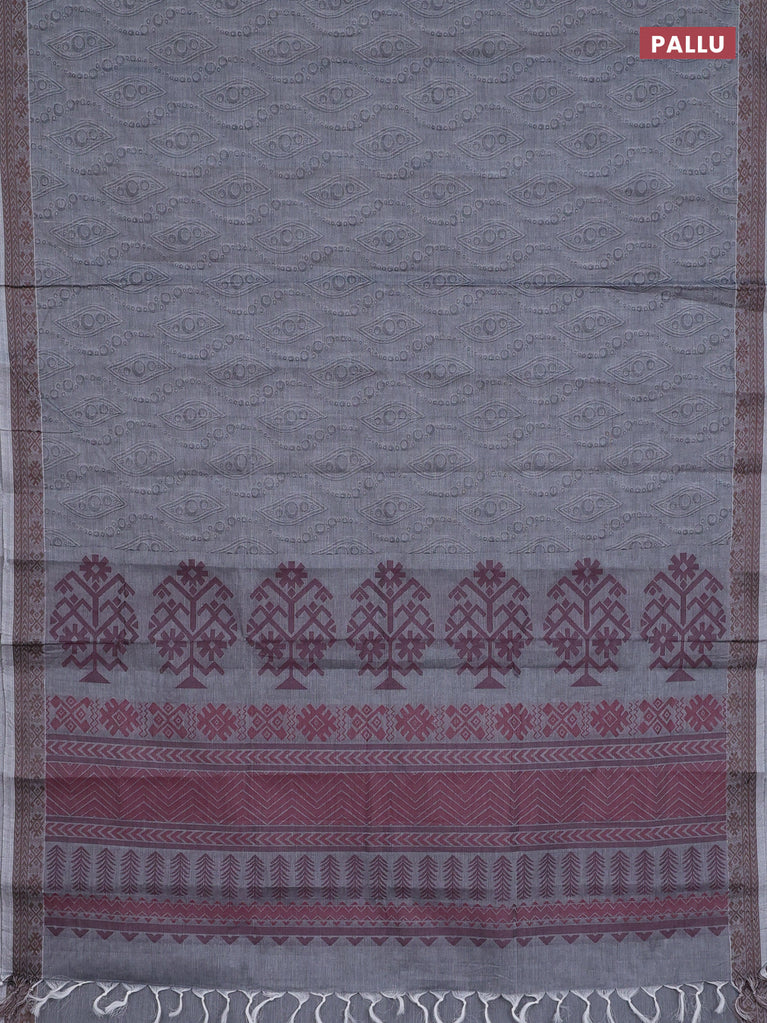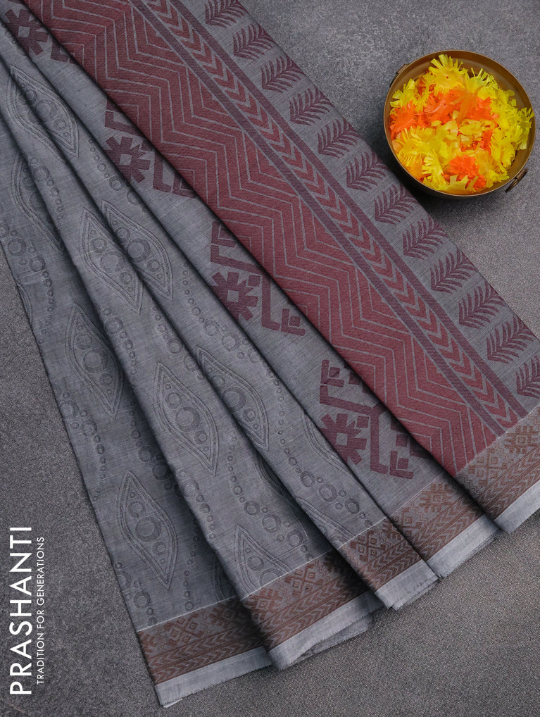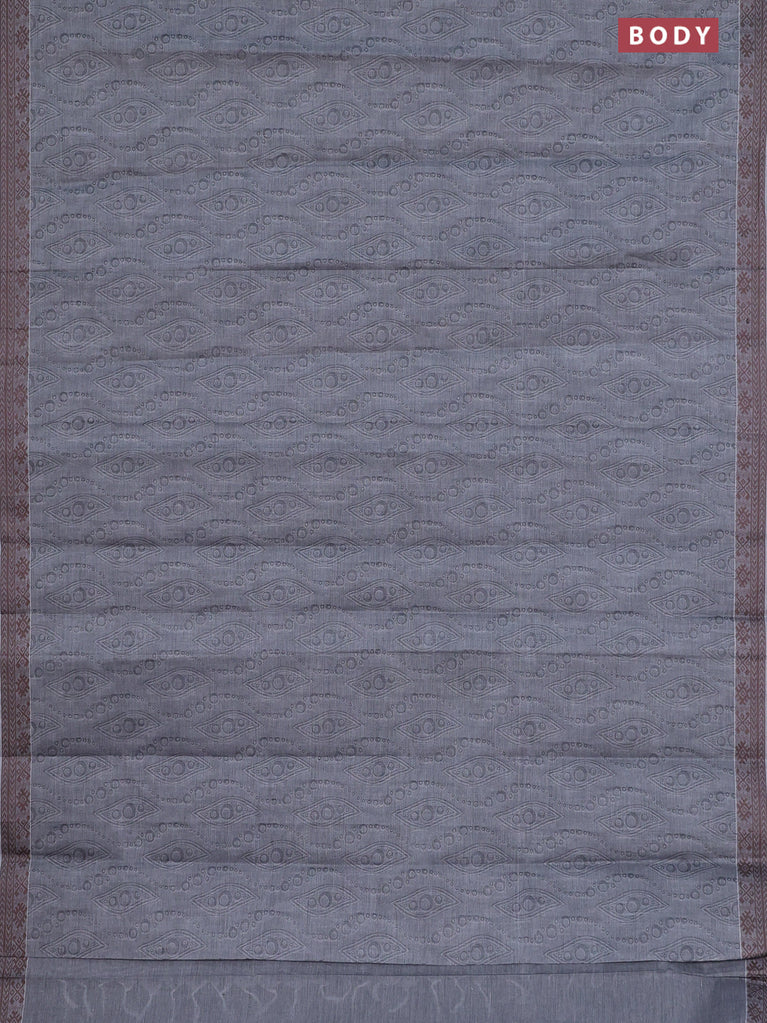 Coimbatore cotton saree grey and coffee brown with allover self emboss and thread woven border