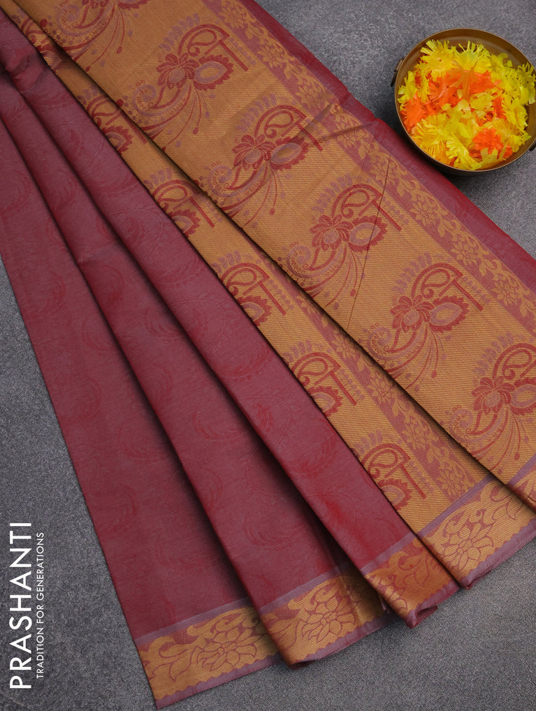 Coimbatore cotton saree maroon and sandal with allover self emboss and thread woven border