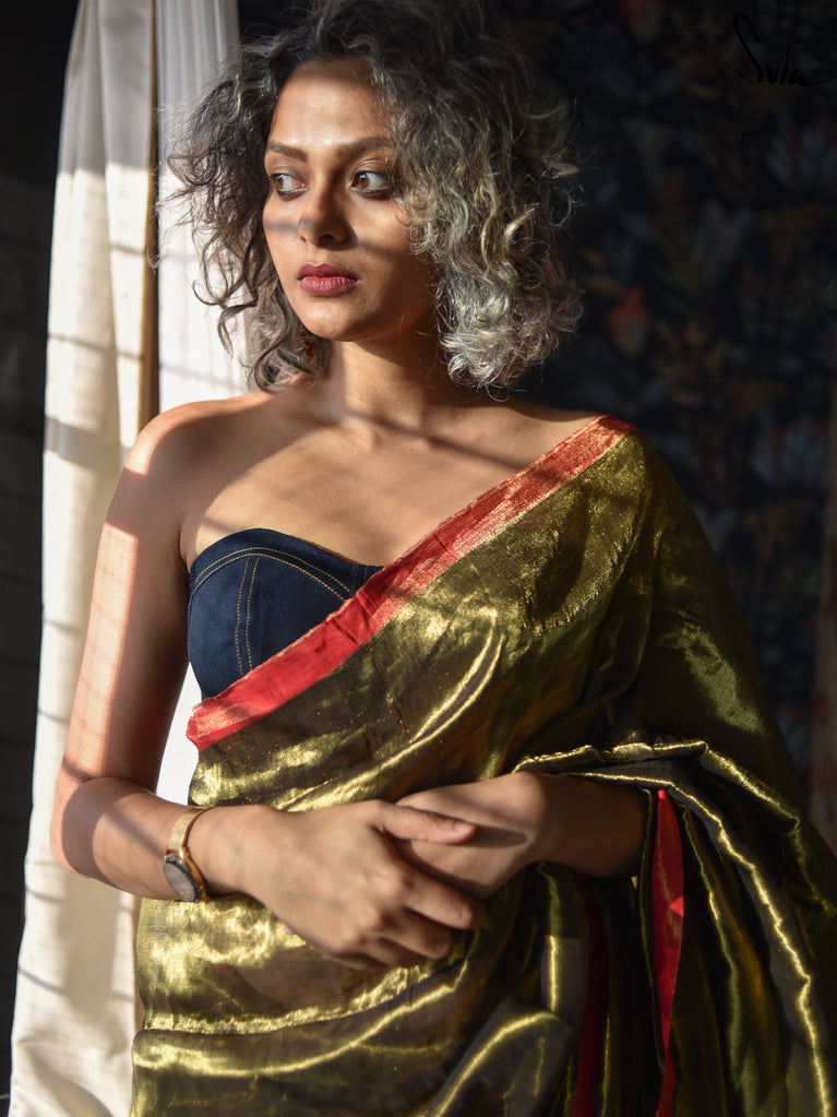 This saree has been handwoven by a master weaver in the Mashru tradition. The Mashru weave is said to have originated in West Asia, in the 19th Century. The fabric is woven with a silk weft and a fine cotton warp. It thus combines the ageless comfort of cotton and the timeless aesthetic of silk, elevated by the presence of gold and silver zari.