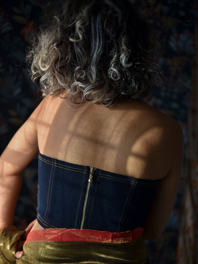 Country Blue Bliss, a stunning blouse inspired by classic corsetry, featuring a flattering fitted silhouette with structured seams that define the waist. The strapless design and sweetheart neckline add a timeless, feminine touch, while the back zip ensures a secure and comfortable fit. The deep blue hue radiates sophistication, and the contrasting yellow stitch lines provide a playful pop of color. Crafted from high-quality material, this blouse offers both structure and comfort, making it perfect for all-day wear. The corset-inspired design cinches the waist, creating an elegant, hourglass shape.