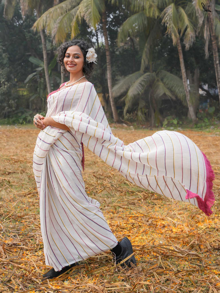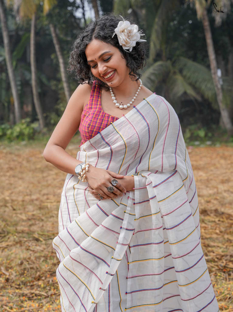 A rainbow of tradition, this multicolored mul khesh saree captures the essence of Holi in its vibrant, handwoven stripes. Each handwoven thread tells a story of craftsmanship passed down through generations, woven with care and joy. The playful jhalar tassels, like droplets of color, swing with every step, carrying a mischievous wink that only the festival of colors can bring. Wrapped in this saree, you’re wearing the spirit of an age-old tradition, reimagined for today’s celebrant.