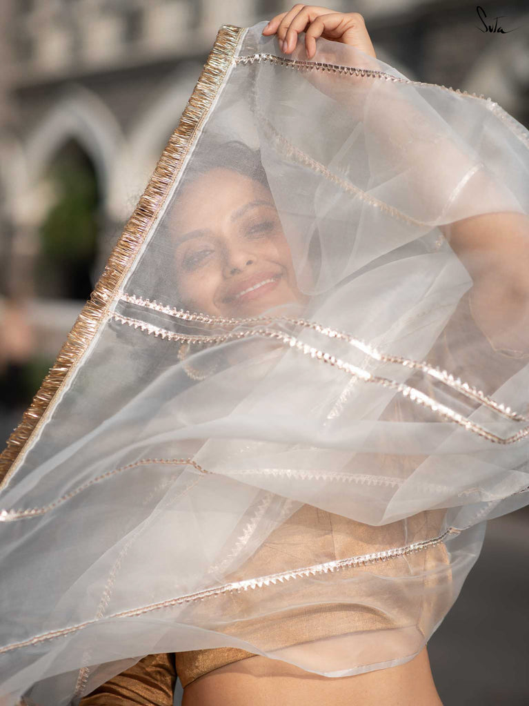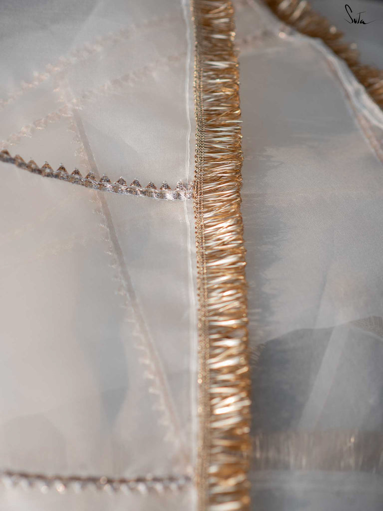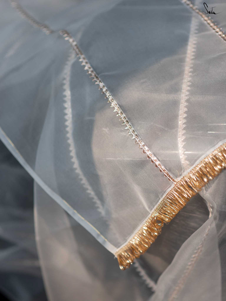 The moon called and asked for its glow back. Fizai Chandni’s off-white organza is pure celestial wonder. Draping it is like wearing a halo of moonlight unapologetically radiant and a total showstopper.