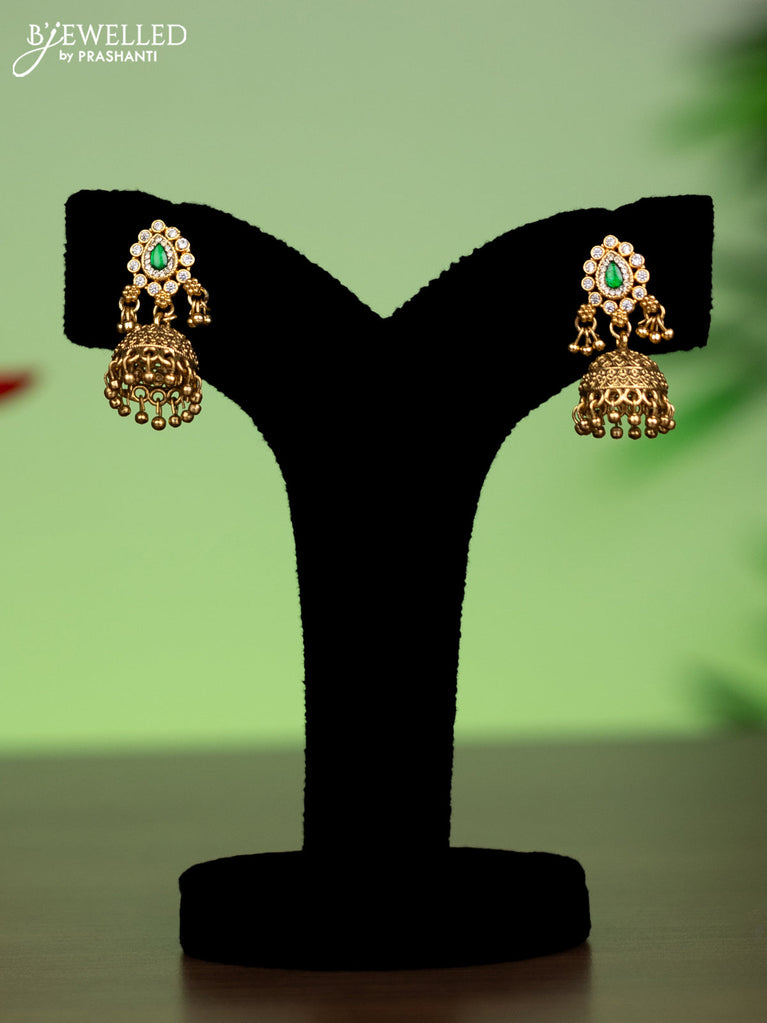 Jadau attigai necklace with green jadau & cz stones and golden beads hanging