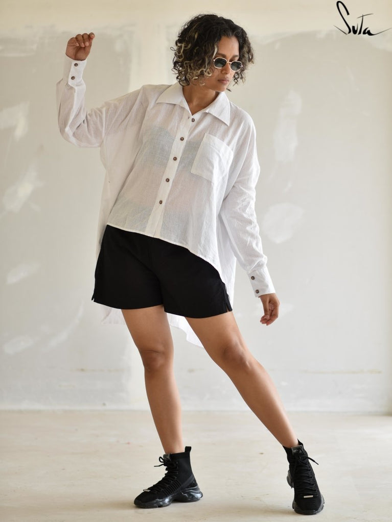 This pristine white handloom cotton shirt thats been designed such that one size flatters all body types (XS to 2XL) will envelop you in a soft, freeing embrace.