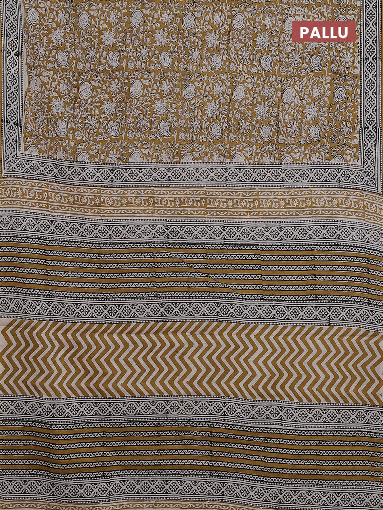 Jaipur cotton saree mustard and black with allover kalamkari prints and printed border