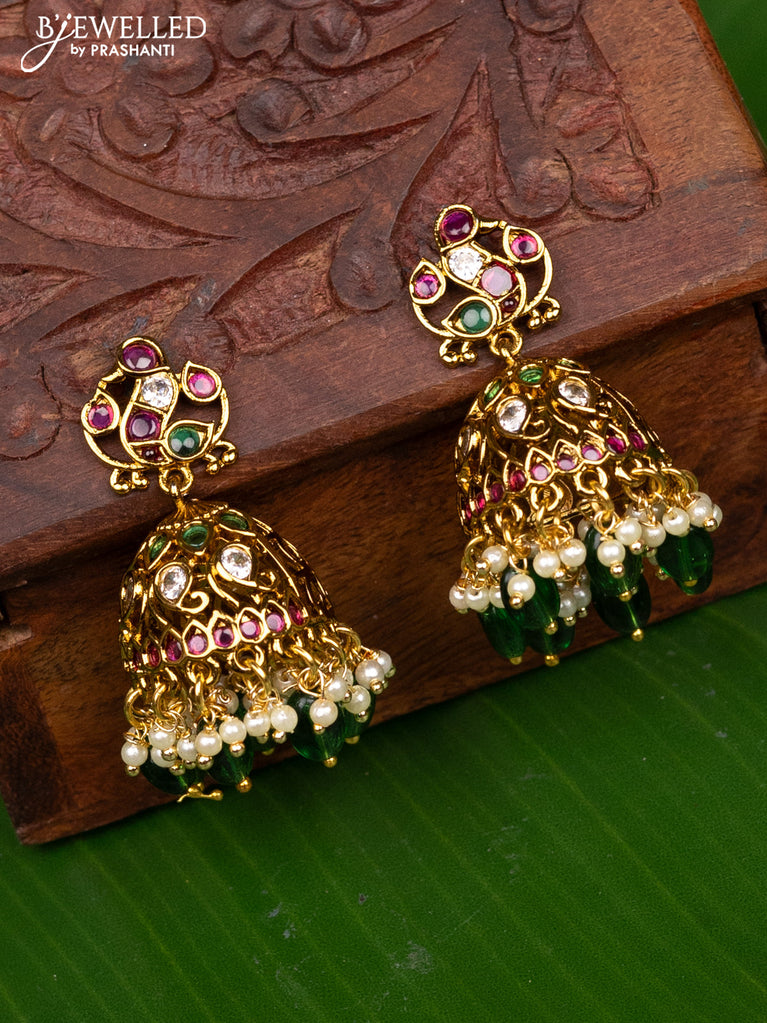 Antique medium size peacock design jhumka with kemp and pearl hangings