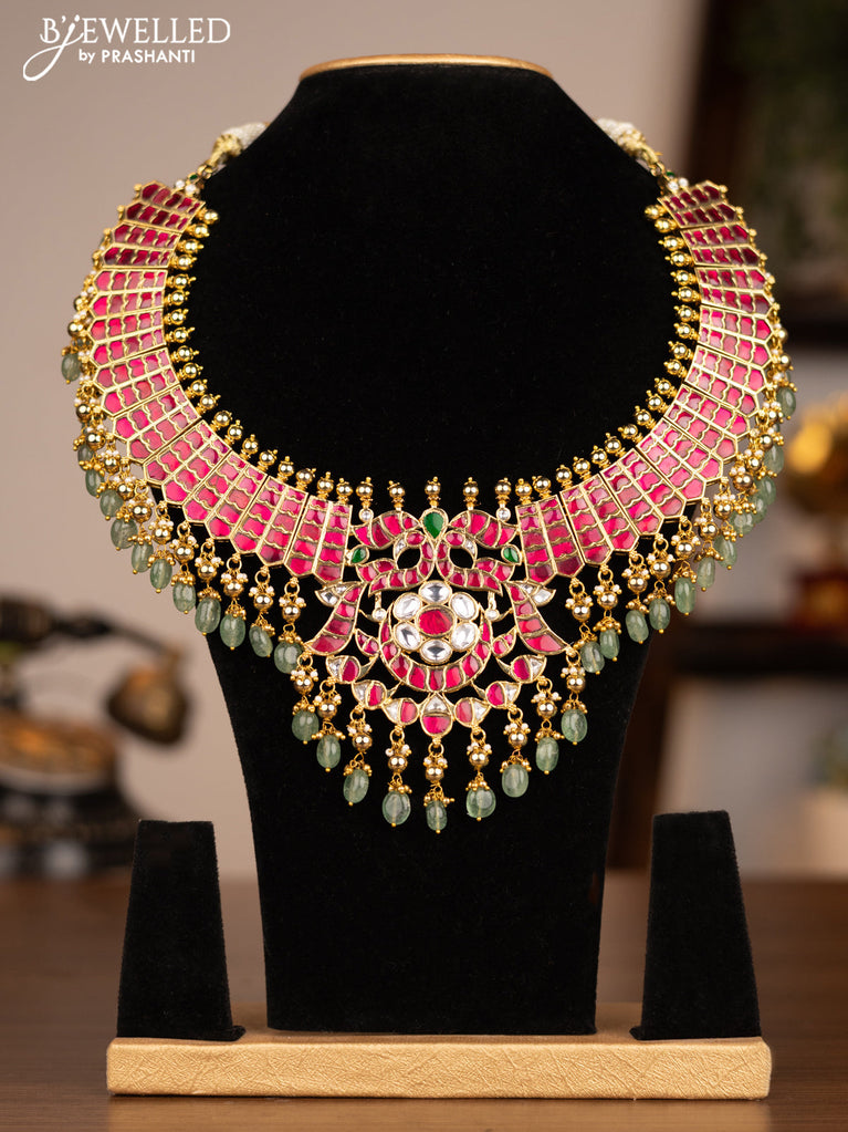 Antique necklace with jadau kundan stones and green beads & golden beads hanging without earrings