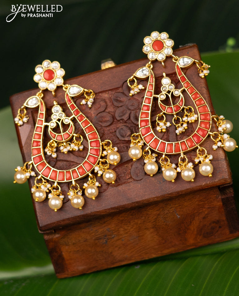 Antique screw type earrings peacock design with pavalam & kundan stones and pearl hangings