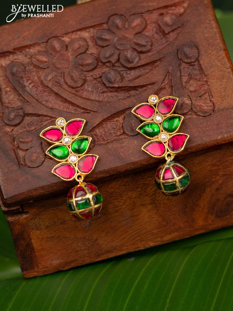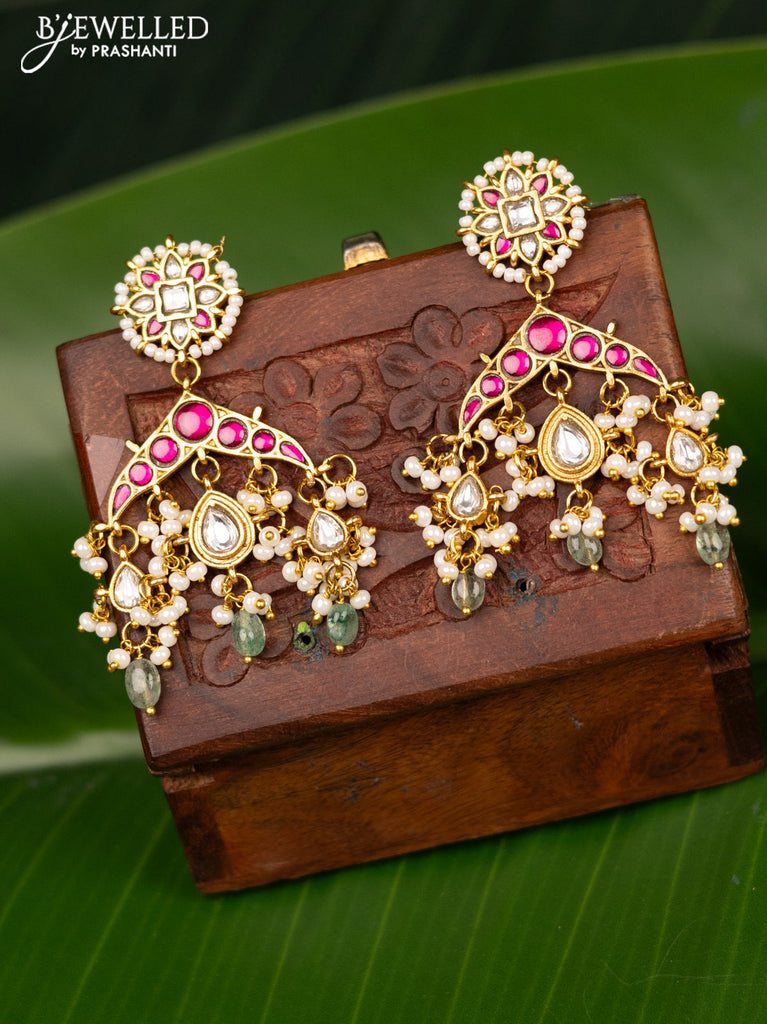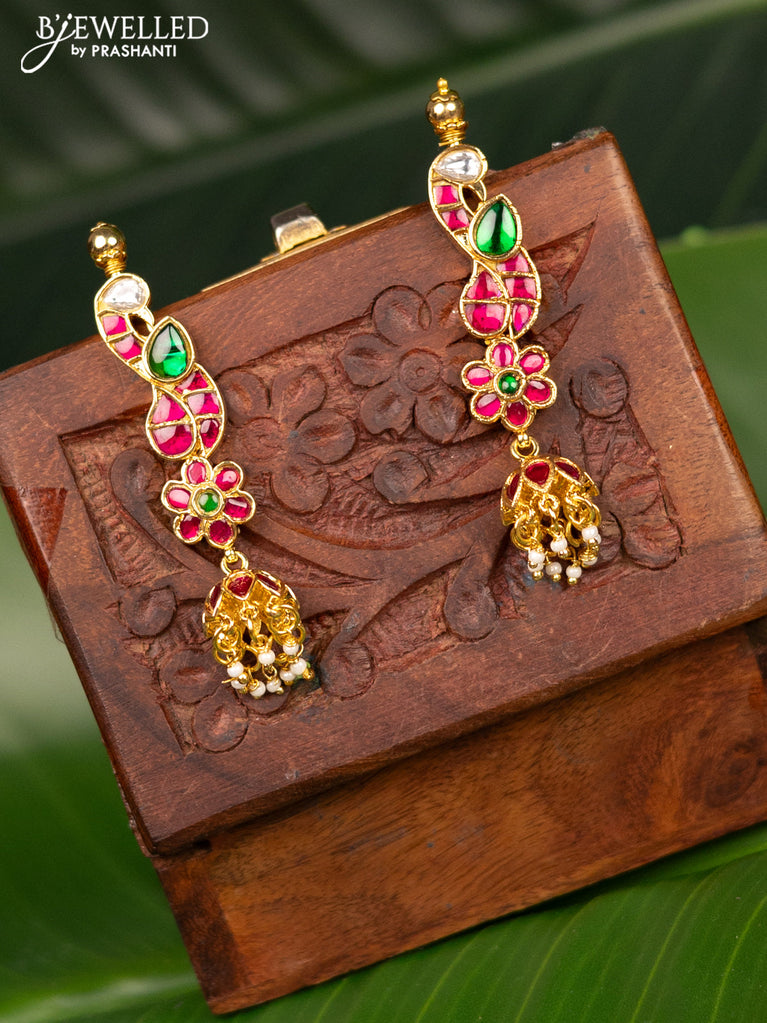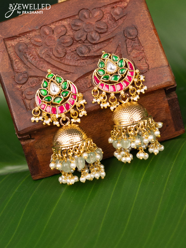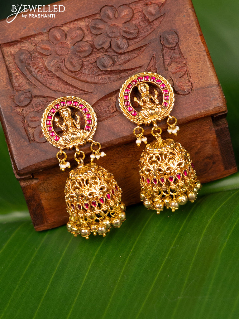 Antique screw type jhumka lakshmi design with pink jadau stones and golden beads hanging