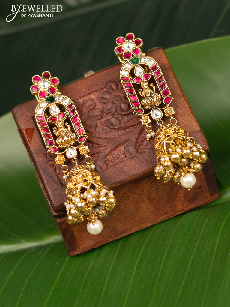 Antique screw type jhumka lakshmi design with jadau kundan stones and pearl & golden beads hanging
