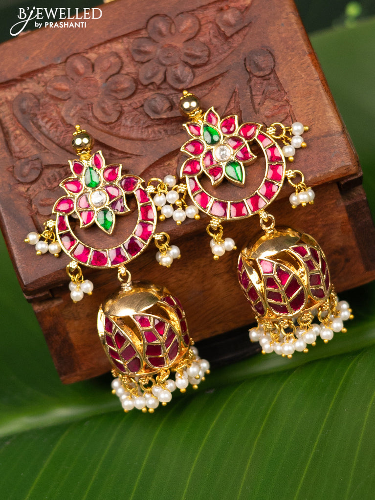 Antique screw type jhumka chandbali design with jadau kundan stones and pearl hangings