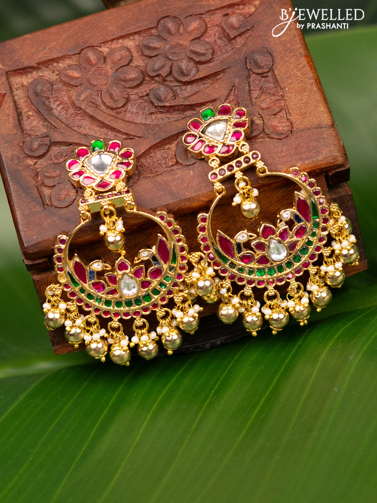 Antique screw type jhumka chandbali design with jadau kundan stones and pearl & beads hanging