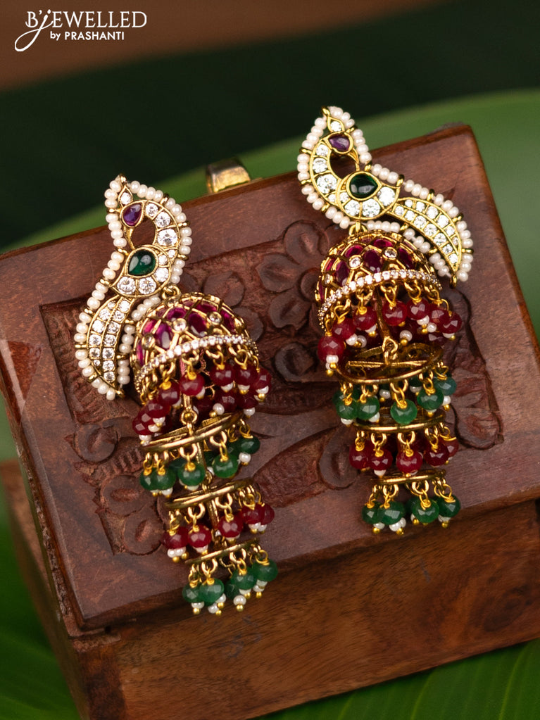 Antique triple layer jhumka peacock design kemp & cz stones beads hangings