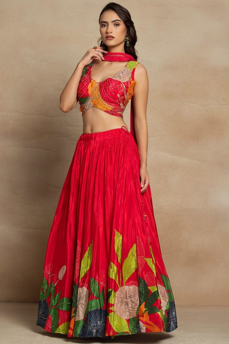 This yellow chinnon lehenga features a delicate floral print, paired with a heavy hand-embroidered blouse adorned with multicolor sequin work. Finished with a soft net dupatta, the ensemble offers a vibrant yet graceful look—perfect for haldi functions, festive celebrations, and daytime wedding events.