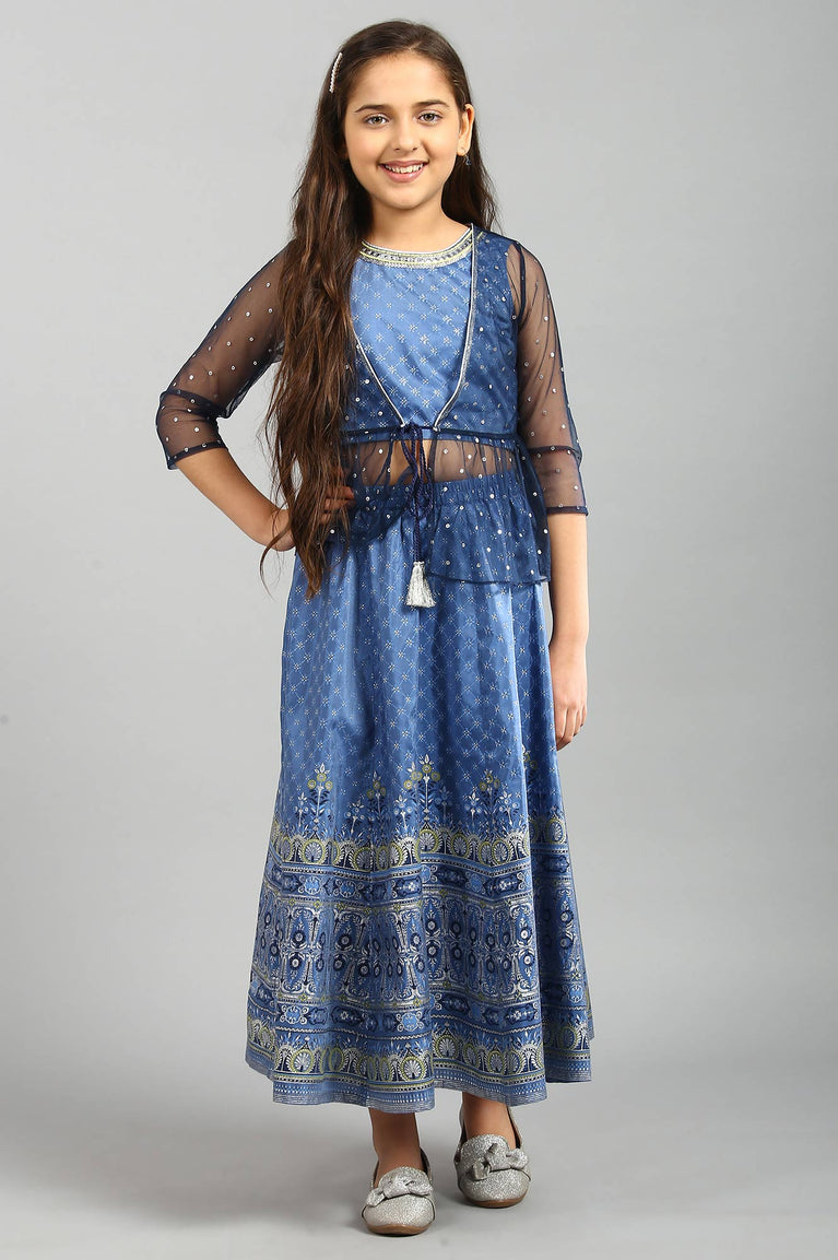 For an elevated and modern ethnic look, you can pick this top and palazzo set from Aurelia. The set includes A-line panelled top in floral print and blue semi-flared palazzo. And to complete the look, the set also flatters kota fabric pink dupatta.