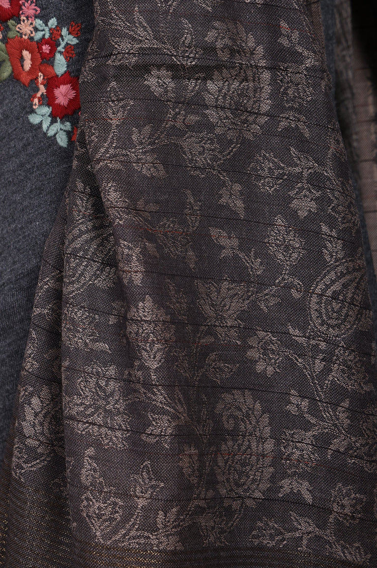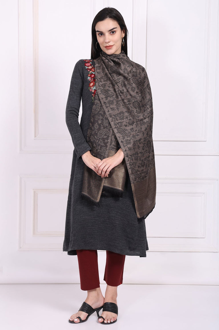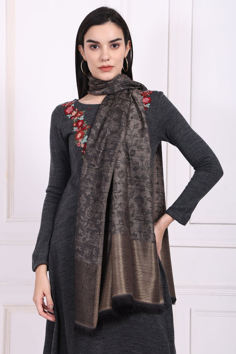 A whisper of heritage for the modern muse, this exquisite shawl for women is a masterpiece of classic textile art. It's the kind of piece you'll reach for when you want to add a layer of quiet sophistication. Intricately woven from a warm, soft wool-blend fabric, it feels wonderfully luxurious against the skin, promising comfort on cooler days. The stunning design showcases a timeless, all-over paisley pattern in sophisticated shades of Earthen Brown and Charcoal, a beautiful result of its traditional yarn-dyed creation. This beautiful ethnic stole is further enhanced with subtle metallic fibres woven throughout the fabric, which catch the light with a gentle, understated shimmer that lends it an air of quiet opulence. Measuring a generous 2.1 metres in length and 75cm in width, this designer wrap offers endless versatile styling options—drape it elegantly over the shoulders or loop it for a cozier feel. Its completely opaque fabric provides modest and graceful coverage, while the edges are perfectly finished with a delicate, short fringe, adding a touch of classic texture. Ideal for festive gatherings, formal events, or simply elevating your everyday winter style, this elegant ethnic wrap for women is a truly timeless addition to your accessory collection.