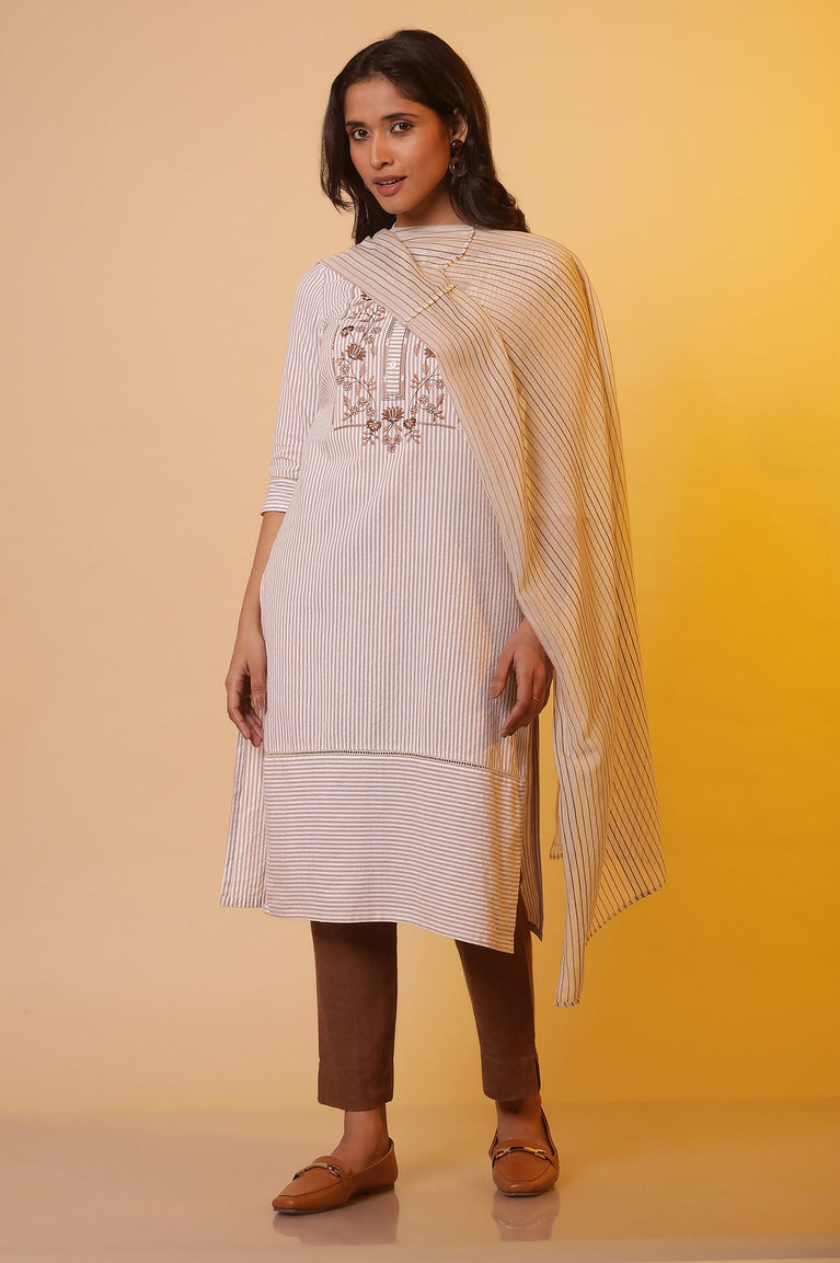 For An Elegant And Classy Look This Season Get This Chic New Beige Kurta In Stripe Print. It Has Straight Silhouette And Gives Regular Fit, And Make This Kurta A Perfect Option For Light Festive. It Comes In Round Neck And Has Shirt Sleeves.