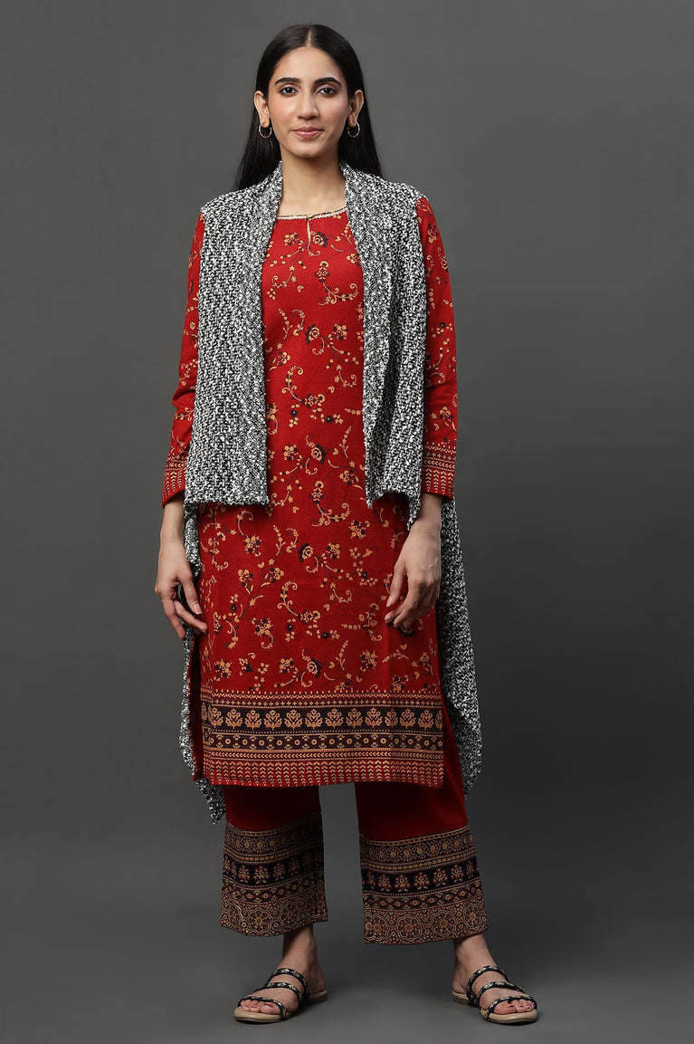 Amp up your look with this pretty black and white checker kurta set. The set A-line kurta with braided white belt and has round neckline. It is paired with black solid tights.
