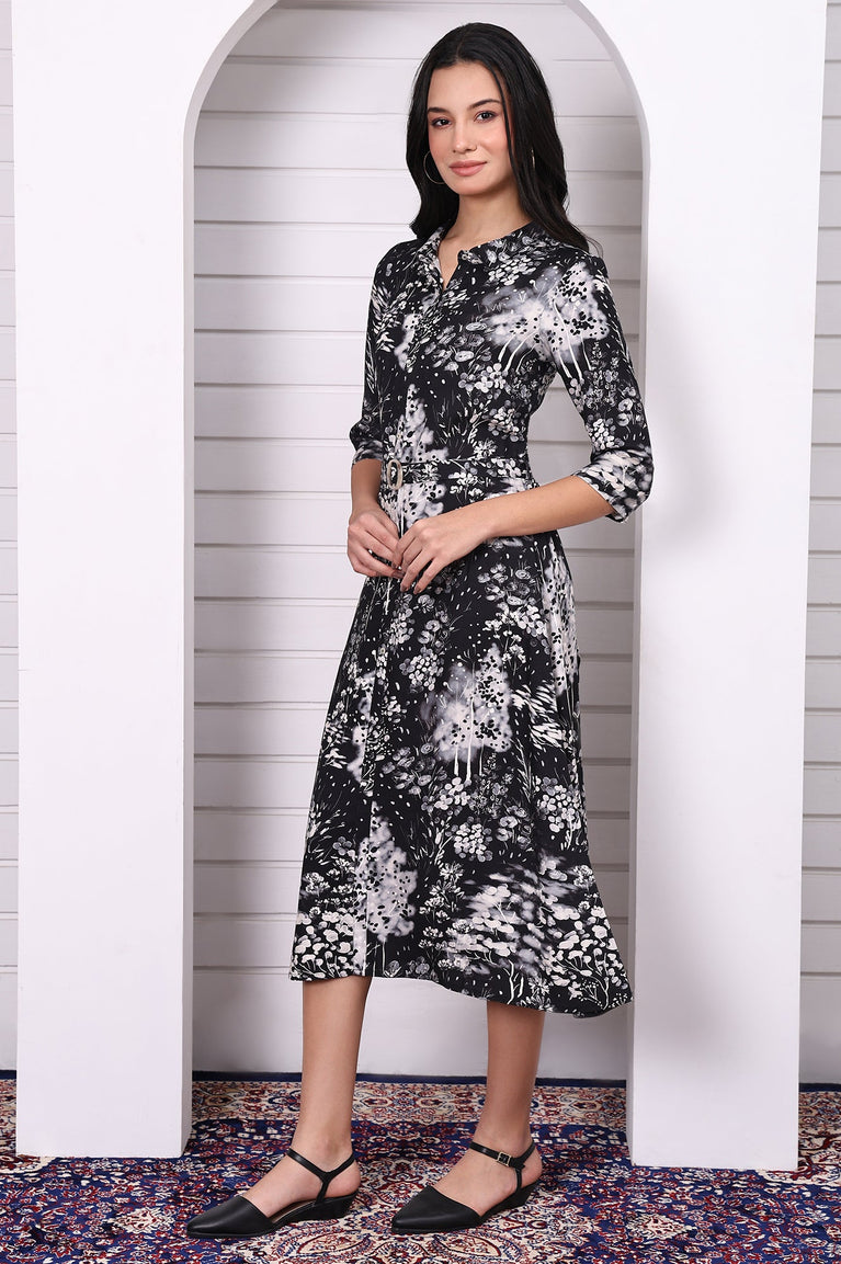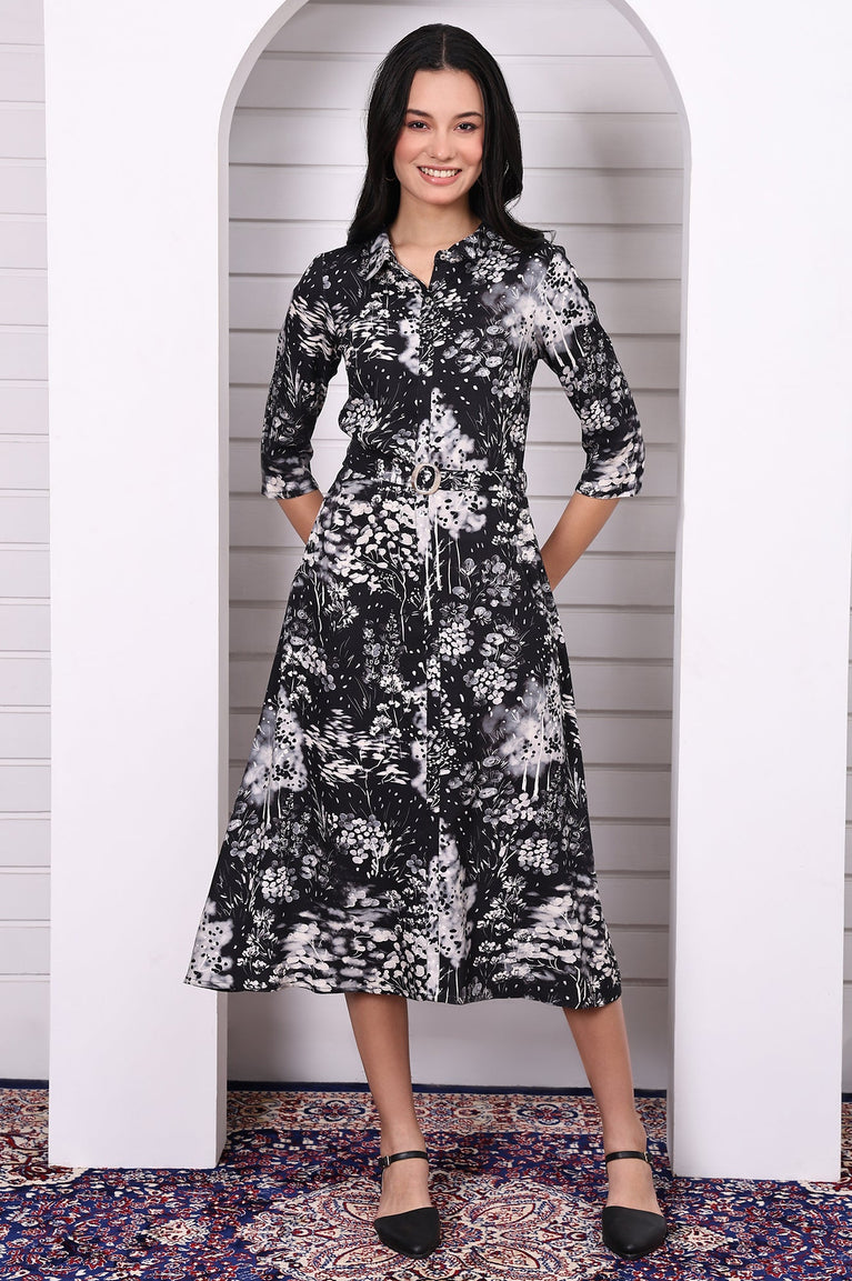 Step into a playful yet polished vibe with this black floral printed short flared dress, cinched at the waist with a fabric belt. Crafted in a fluid, soft-touch fabric, this dress features an all-over floral print in muted tones that pop against the deep black base. The flared silhouette adds movement and charm, while the detachable waist belt defines the shape for a flattering fit. With 3/4th sleeves and shirt collar neckline, this floral print black flared dress is an ideal choice for casual outings, day events, or weekend getaways. Its above-knee length and easy fit make it a chic fusion of Indian motifs and modern style.